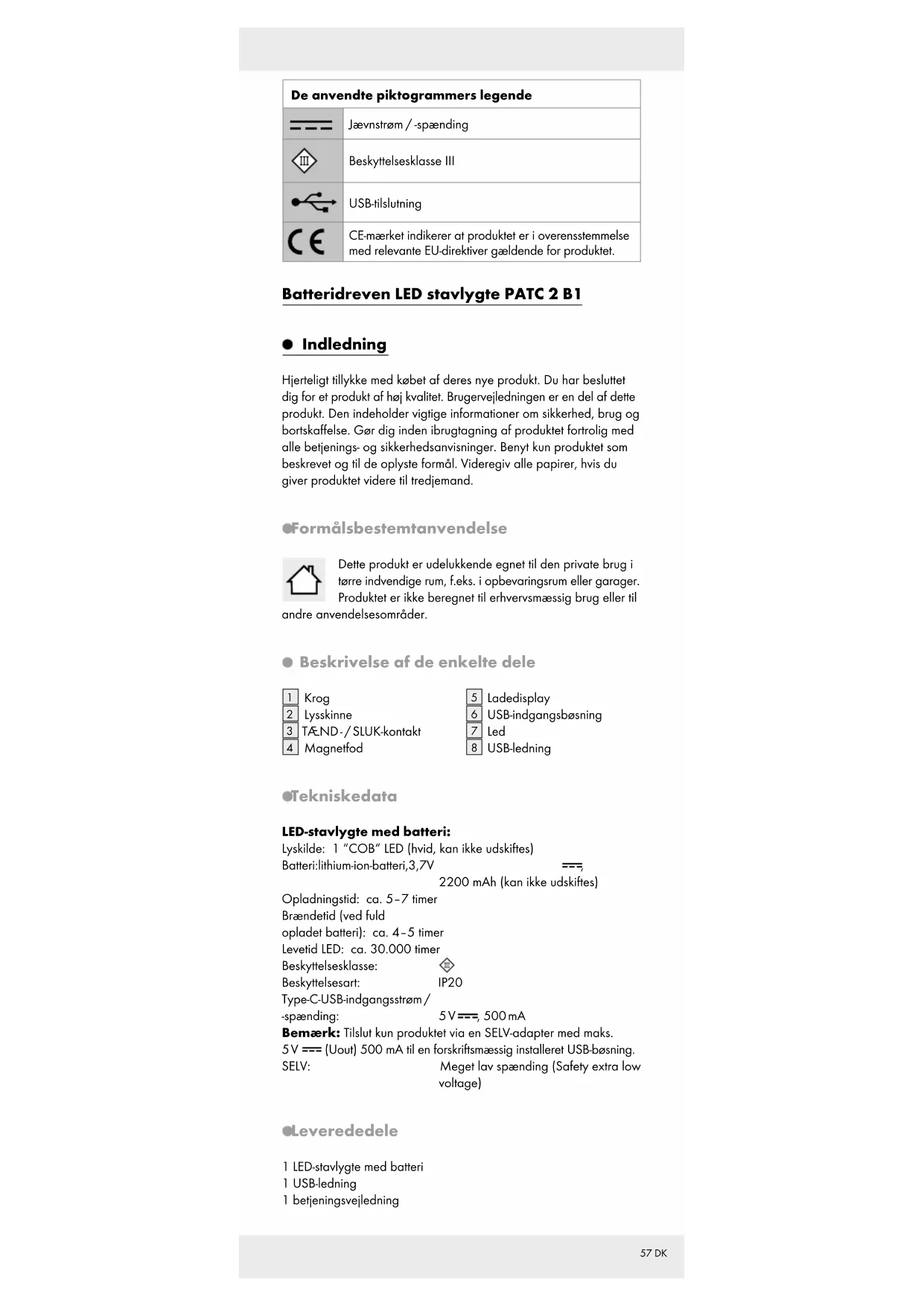 2200 mAh (kan ikke udskiftes) Opladningstid: ca. 5–7 timer Brændetid (ved fuld opladet batteri): ca. 4–5 timer Levetid LED: ca. 30.000 timer Beskyttelsesklasse: Beskyttelsesart: IP20 Type-C-USB-indgangsstrøm / -spænding: 5 V , 500 mA Bemærk: Tilslut kun produktet via en SELV-adapter med maks. 5 V (Uout) 500 mA til en forskriftsmæssig installeret USB-bøsning. SELV: Meget lav spænding (Safety extra low voltage) Leverede dele 1 LED-stavlygte med batteri 1 USB-ledning 1 betjeningsvejledning58 DK Sikkerhedshenvisninger Gør dig inden den første ibrugtagning af produktet fortrolig med alle betjenings- og sikkerhedshenvisninger! Udlever desuden alle doku- menter ved overdragelse af produktet til tredjemand!