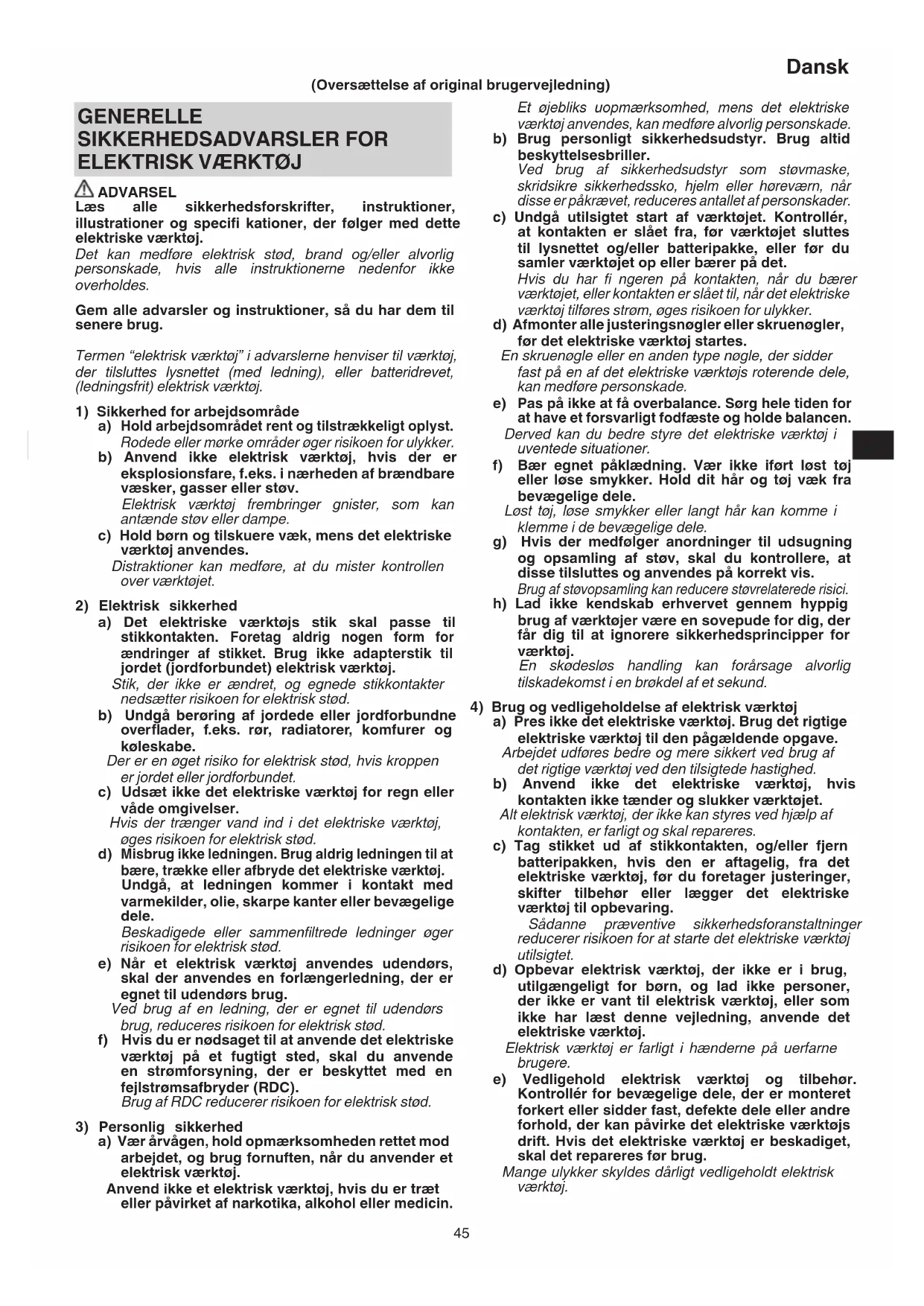 ADVARSEL Læs alle sikkerhedsforskrifter, instruktioner, illustrationer og specifi kationer, der følger med dette elektriske værktøj. Det kan medføre elektrisk stød, brand og/eller alvorlig personskade, hvis alle instruktionerne nedenfor ikke overholdes. Gem alle advarsler og instruktioner, så du har dem til senere brug. Termen “elektrisk værktøj” i advarslerne henviser til værktøj, der tilsluttes lysnettet (med ledning), eller batteridrevet, (ledningsfrit) elektrisk værktøj.