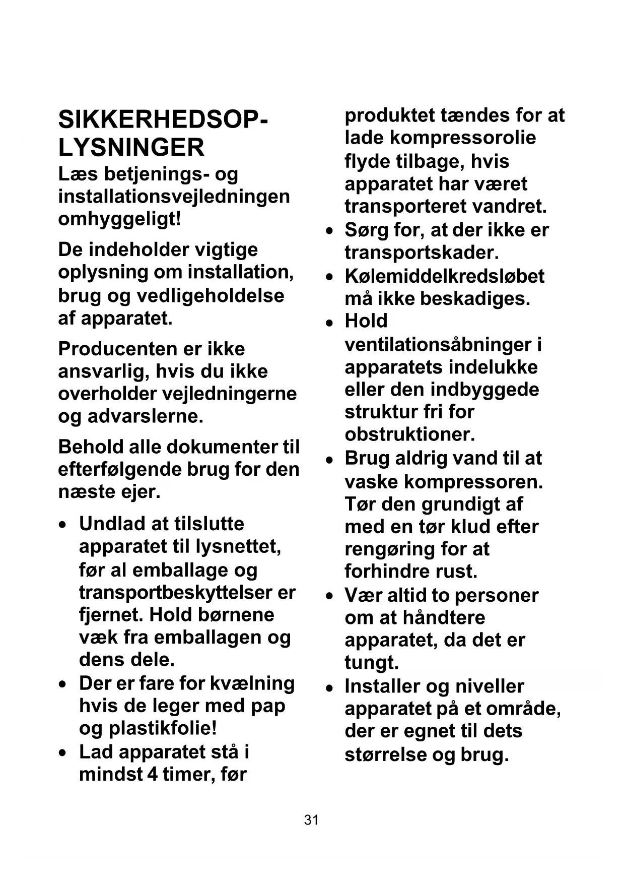 Lad apparatet stå i mindst 4 timer, før produktet tændes for at lade kompressorolie flyde tilbage, hvis apparatet har været transporteret vandret.