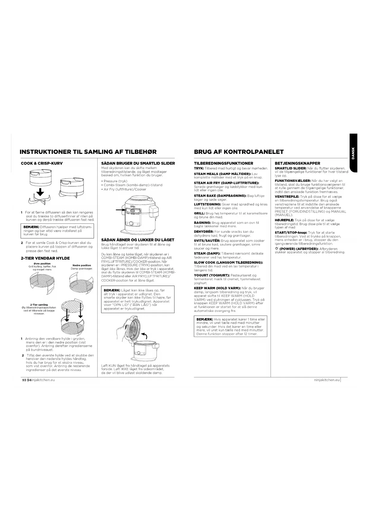 1 Anbring den vendbare hylde i gryden, mens den er i den nedre position (vist ovenfor). Anbring derefter ingredienserne på bundniveauet. 2 Tilføj den øverste hylde ved at skubbe den henover den nederste hyldes håndtag, hvis du har brug for et ekstra niveau, som vist ovenfor. Anbring de resterende ingredienser på det øverste niveau. BEMÆRK: Diuseren hjælper med luftstrøm- ningen og bør altid være installeret på kurven før brug. Øvre position Grill kylling, bøer, fisk og meget mere. Nedre position Damp grøntsager. 2-Tier samling Øg tilberedningskapaciteten ved at tilberede på begge niveauer. REHEATSOUS VIDE SLOW COOK YOGURT REHEATSOUS VIDE SLOW COOK YOGURT DANSK95 96 ninjakitchen.eu ninjakitchen.eu