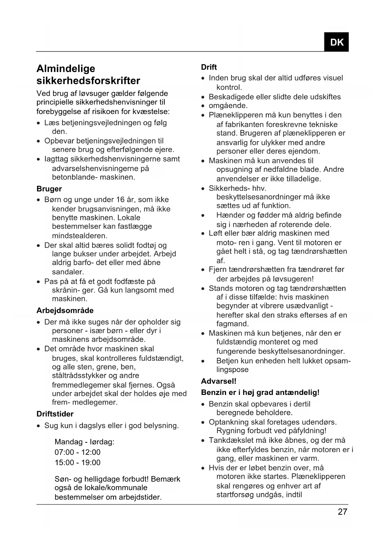 - Sug kun i dagslys eller i god belysning. Mandag - Iørdag: 07:00 - 12:00 15:00 - 19:00 Søn- og helligdage forbudt! Bemærk også de lokale/kommunale bestemmelser om arbejdstider. Drift