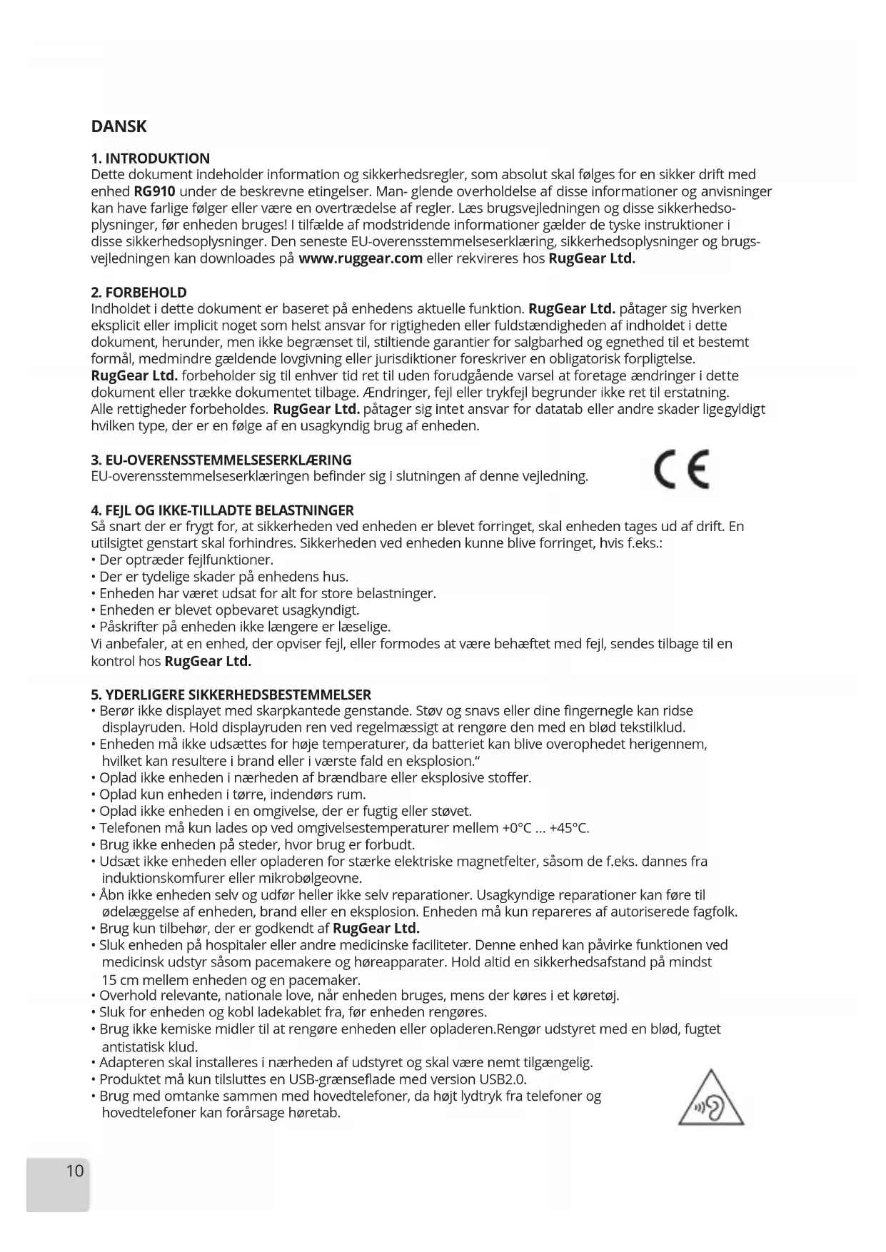 Dette dokument indeholder information og sikkerhedsregler, som absolut skal følges for en sikker drift med enhed RG910 under de beskrevne etingelser. Man- glende overholdelse af disse informationer og anvisninger kan have farlige følger eller være en overtrædelse af regler. Læs brugsvejledningen og disse sikkerhedso- plysninger, før enheden bruges! I tilfælde af modstridende informationer gælder de tyske instruktioner i disse sikkerhedsoplysninger. Den seneste EU-overensstemmelseserklæring, sikkerhedsoplysninger og brugs- vejledningen kan downloades på www.ruggear.com eller rekvireres hos RugGear Ltd.