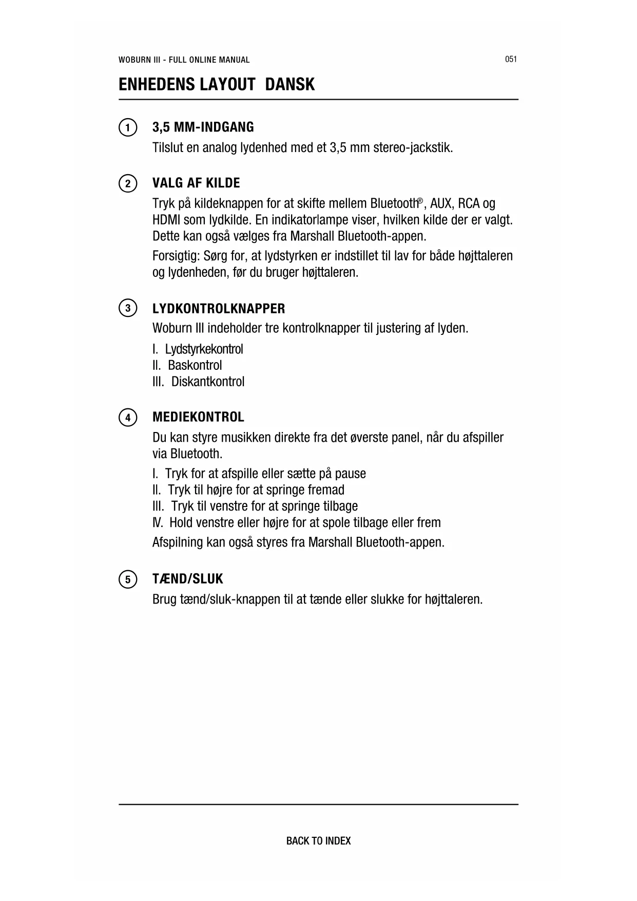 , AUX, RCA og HDMI som lydkilde. En indikatorlampe viser, hvilken kilde der er valgt. Dette kan også vælges fra Marshall Bluetooth-appen. Forsigtig: Sørg for, at lydstyrken er indstillet til lav for både højttaleren og lydenheden, før du bruger højttaleren.