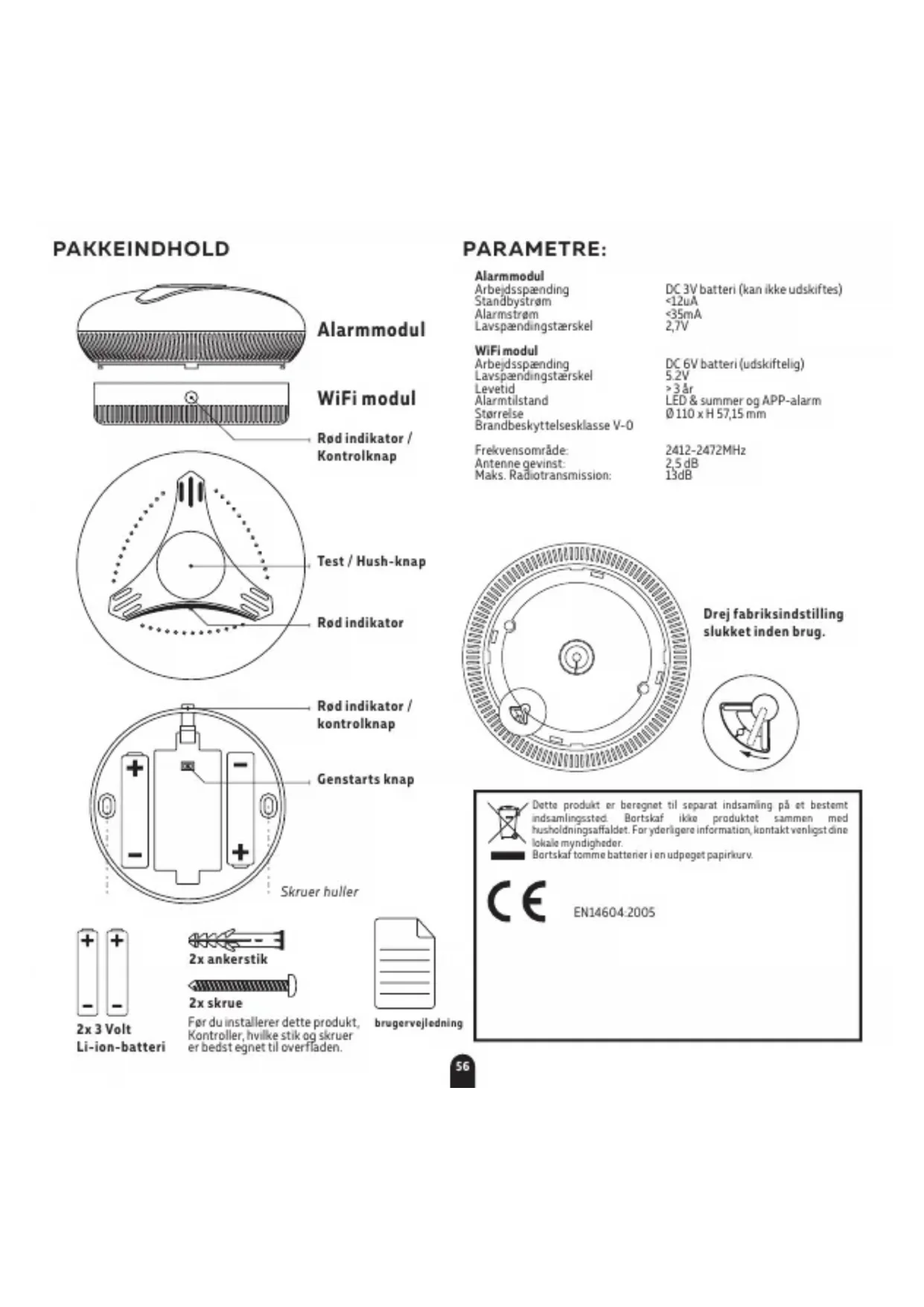 Rengør røgalarmen mindst en gang om måneden; støvsug forsigtigt ydersiden af røgalarmen ved hjælp af dit husstands vakuum til blød børste tilbehør. Test røgalarmen efter rengøring. Brug aldrig vand, rengøringsmidler eller opløsningsmidler, da de kan beskadige enheden.60 Hvis røgalarmen forurenes af overdreven snavs, støv og / eller snavs og giver uønskede alarmer, skal du straks udskifte enheden. § 6 Funktionsbeskrivelse Lavspændingsalarm: Når den indbyggede batterispænding på røgdetektoren er under 2,7 V, blinker den røde indikatorlampe en gang hvert 50 sekund, ledsaget af en ‘Di’ lyd. Appen viser (også) en advarsel i statuslinjen. Fejl ved røgalarm: Røgalarms LED blinker hvert 8. sekund og ledsages af en summer. Appstatus viser en alarmfejl. Hvis enheden fungerer normalt, blinker den røde LED- indikator en gang hvert 50. sekund. WiFi-modulbatterier: Batteriets levetid på basisbatterierne er 3 år. Hvis strømindikatoren i appen bliver rød, skal du udskifte batterierne i Wifi-modulet for at sikre, at kommunikationen opretholdes. § 7 Hvad skal man gøre i tilfælde af brand Kontakt din lokale brandvæsen for, hvad du kan gøre i tilfælde af brand. § 8 Fejlfinding Nulstil procedure: Hvis enheden ikke får adgang til netværket eller går ned på grund af forkert betjening, skal du skrue wifi-modulet og trykke på nulstillingsknappen for at genstarte installationsproceduren. Problem: Rød LED blinker, og alarmen lyder et bip hvert 50 sekund Løsning: Alarmmodulets batteri er løbet tør, udskift enheden. Problem: Intet svar under APP-drift Løsning: Kontroller, at netværket og strømforsyningen er normal. Problem: APP-batteriet lyser rødt Løsning: Wifi-modulets batteri er opbrugt. Udskift venligst batterierne. Problem: Røgalarm udløses, når beboerne laver mad eller bruser Løsning: 1, rengør detektoren, se afsnit 5 “Testning, vedligeholdelse og rengøring”; 2, installer detektoren på et andet sted, se afsnit 3 “Lnstallation Location”