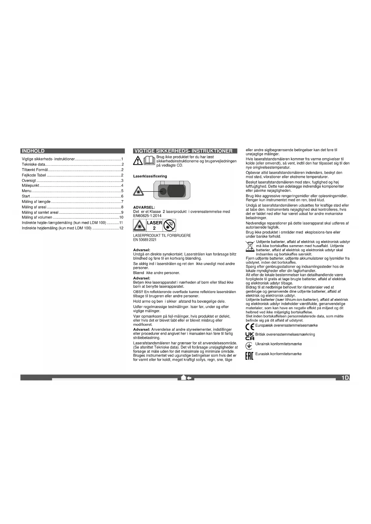 - EN 50689:2021 Advarsel: Undgå en direkte synskontakt. Laserstrålen kan forårsage blitz blindhed og føre til en kortvarig blænding. Se aldrig ind i laserstrålen og ret den ikke unødigt mod andre personer. Blænd ikke andre personer. Advarsel: Betjen ikke laserapparatet i nærheden af børn eller tillad ikke børn at benytte laserapparatet. OBS!! En reekterende overade kunne reektere laserstrålen tilbage til brugeren eller andre personer. Hold arme og ben i sikker afstand fra bevægelige dele. Udfør regelmæssige testmålinger. Især før, under og efter vigtige målinger. Vær opmærksom på fejl-målinger, hvis produktet er defekt, eller hvis det er blevet tabt eller er blevet misbrug eller modiceret. Advarsel: Anvendelse af andre styreelementer, indstillinger eller procedurer end angivet her i manualen kan føre til farlig strålebelastning. Laserafstandsmåleren har grænser for sit anvendelsesområde. (Se afsnittet Tekniske data). Det vil forårsage unøjagtigheder at forsøge at måle uden for det maksimale og minimale område. Bruges instrumentet ved ugunstige betingelser som hvis det er for varmt eller for koldt, meget kraftigt sollys, regn, sne, tåge eller andre sigtbegrænsende betingelser kan det føre til unøjagtige målinger. Hvis laserafstandsmåleren kommer fra varme omgivelser til kolde (eller omvendt), så vent, indtil den har tilpasset sig til den nye omgivelsestemperatur. Opbevar altid laserafstandsmåleren indendørs, beskyt den mod stød, vibrationer eller ekstreme temperaturer. Beskyt laserafstandsmåleren mod støv, fugtighed og høj luftfugtighed. Dette kan ødelægge indvendige komponenter eller påvirke nøjagtigheden. Brug ikke aggressive rengøringsmidler eller opløsningsmidler. Rengør kun instrumentet med en ren, blød klud. Undgå at laserafstandsmåleren udsættes for kraftige stød eller at tabe den. Instrumentets nøjagtighed skal kontrolleres, hvis det er faldet ned eller har været udsat for andre mekaniske belastninger. Nødvendige reparationer på dette laserapparat skal udføres af autoriserede fagfolk. Brug ikke produktet i områder med eksplosions-fare eller under barske forhold. Udtjente batterier, aald af elektrisk og elektronisk udstyr må ikke bortskaes sammen med husaald. Udtjente batterier, aald af elektrisk og elektronisk udstyr skal indsamles og bortskaes særskilt. Fjern udtjente batterier, udtjente akkumulatorer og lysmidler fra udstyret, inden det bortskaes. Spørg efter genbrugsstationer og indsamlingssteder hos de lokale myndigheder eller din fagforhandler. Alt efter de lokale bestemmelser kan detailhandlende være forpligtede til gratis at tage brugte batterier, aald af elektrisk og elektronisk udstyr tilbage. Bidrag til at nedbringe behovet for råmaterialer ved at genbruge og genanvende dine udtjente batterier, aald af elektrisk og elektronisk udstyr. Udtjente batterier (især lithium-ion-batterier), aald af elektrisk og elektronisk udstyr indeholder værdifulde, genanvendelige materialer, som kan have en negativ eekt på miljøet og dit helbred ved ikke miljørigtig bortskaelse. Slet inden bortskaelsen personrelaterede data, som måtte bende sig på dit aald af udstyret. Europæisk overensstemmelsesmærke Britisk overensstemmelsesmærkning Ukrainsk konformitetsmærke Eurasisk konformitetsmærke INDHOLD Vigtige sikkerheds- instruktioner p. 1