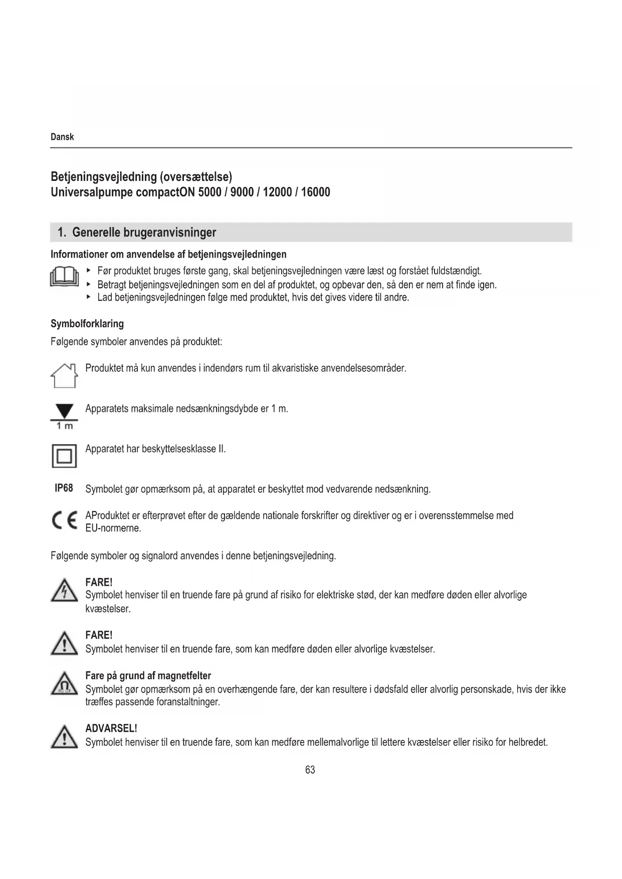 Informationer om anvendelse af betjeningsvejledningen ▶ Før produktet bruges første gang, skal betjeningsvejledningen være læst og forstået fuldstændigt. ▶ Betragt betjeningsvejledningen som en del af produktet, og opbevar den, så den er nem at nde igen. ▶ Lad betjeningsvejledningen følge med produktet, hvis det gives videre til andre. Symbolforklaring Følgende symboler anvendes på produktet: Produktet må kun anvendes i indendørs rum til akvaristiske anvendelsesområder. Apparatets maksimale nedsænkningsdybde er 1 m. Apparatet har beskyttelsesklasse II. Symbolet gør opmærksom på, at apparatet er beskyttet mod vedvarende nedsænkning. AProduktet er efterprøvet efter de gældende nationale forskrifter og direktiver og er i overensstemmelse med EU-normerne. Følgende symboler og signalord anvendes i denne betjeningsvejledning. FARE! Symbolet henviser til en truende fare på grund af risiko for elektriske stød, der kan medføre døden eller alvorlige kvæstelser. FARE! Symbolet henviser til en truende fare, som kan medføre døden eller alvorlige kvæstelser. Fare på grund af magnetfelter Symbolet gør opmærksom på en overhængende fare, der kan resultere i dødsfald eller alvorlig personskade, hvis der ikke træes passende foranstaltninger. ADVARSEL! Symbolet henviser til en truende fare, som kan medføre mellemalvorlige til lettere kvæstelser eller risiko for helbredet. IP6864 Dansk FORSIGTIG! Symbolet henviser til fare for materielle skader. Info med nyttige informationer og tips. Visning af symbolerne Henvisning til en gur, her henvisning til gur A Du bliver bedt om en handling.