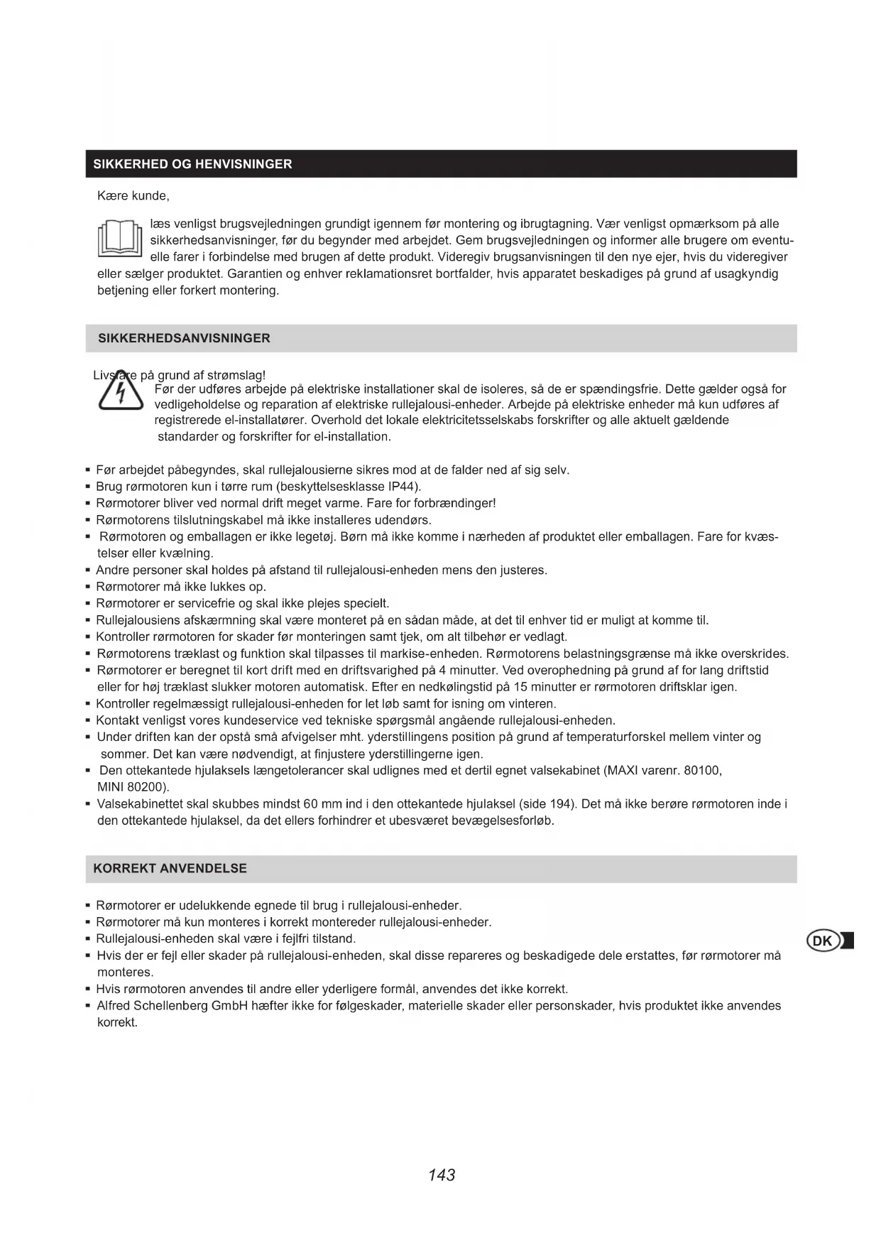 Kære kunde, læs venligst brugsvejledningen grundigt igennem før montering og ibrugtagning. Vær venligst opmærksom på alle sikkerhedsanvisninger, før du begynder med arbejdet. Gem brugsvejledningen og informer alle brugere om eventu- elle farer i forbindelse med brugen af dette produkt. Videregiv brugsanvisningen til den nye ejer, hvis du videregiver eller sælger produktet. Garantien og enhver reklamationsret bortfalder, hvis apparatet beskadiges på grund af usagkyndig betjening eller forkert montering. SIKKERHEDSANVISNINGER Livsfare på grund af strømslag! Før der udføres arbejde på elektriske installationer skal de isoleres, så de er spændingsfrie. Dette gælder også for vedligeholdelse og reparation af elektriske rullejalousi-enheder. Arbejde på elektriske enheder må kun udføres af registrerede el-installatører. Overhold det lokale elektricitetsselskabs forskrifter og alle aktuelt gældende standarder og forskrifter for el-installation. Før arbejdet påbegyndes, skal rullejalousierne sikres mod at de falder ned af sig selv. Brug rørmotoren kun i tørre rum (beskyttelsesklasse IP44). Rørmotorer bliver ved normal drift meget varme. Fare for forbrændinger! Rørmotorens tilslutningskabel må ikke installeres udendørs. Rørmotoren og emballagen er ikke legetøj. Børn må ikke komme i nærheden af produktet eller emballagen. Fare for kvæs- telser eller kvælning. Andre personer skal holdes på afstand til rullejalousi-enheden mens den justeres. Rørmotorer må ikke lukkes op. Rørmotorer er servicefrie og skal ikke plejes specielt. Rullejalousiens afskærmning skal være monteret på en sådan måde, at det til enhver tid er muligt at komme til. Kontroller rørmotoren for skader før monteringen samt tjek, om alt tilbehør er vedlagt. Rørmotorens træklast og funktion skal tilpasses til markise-enheden. Rørmotorens belastningsgrænse må ikke overskrides. Rørmotorer er beregnet til kort drift med en driftsvarighed på 4 minutter. Ved overophedning på grund af for lang driftstid eller for høj træklast slukker motoren automatisk. Efter en nedkølingstid på 15 minutter er rørmotoren driftsklar igen. Kontroller regelmæssigt rullejalousi-enheden for let løb samt for isning om vinteren. Kontakt venligst vores kundeservice ved tekniske spørgsmål angående rullejalousi-enheden. Under driften kan der opstå små afvigelser mht. yderstillingens position på grund af temperaturforskel mellem vinter og sommer. Det kan være nødvendigt, at njustere yderstillingerne igen. Den ottekantede hjulaksels længetolerancer skal udlignes med et dertil egnet valsekabinet (MAXI varenr. 80100, MINI 80200). Valsekabinettet skal skubbes mindst 60 mm ind i den ottekantede hjulaksel (side 194). Det må ikke berøre rørmotoren inde i den ottekantede hjulaksel, da det ellers forhindrer et ubesværet bevægelsesforløb. KORREKT ANVENDELSE Rørmotorer er udelukkende egnede til brug i rullejalousi-enheder. Rørmotorer må kun monteres i korrekt montereder rullejalousi-enheder. Rullejalousi-enheden skal være i fejlfri tilstand. Hvis der er fejl eller skader på rullejalousi-enheden, skal disse repareres og beskadigede dele erstattes, før rørmotorer må monteres. Hvis rørmotoren anvendes til andre eller yderligere formål, anvendes det ikke korrekt. Alfred Schellenberg GmbH hæfter ikke for følgeskader, materielle skader eller personskader, hvis produktet ikke anvendes korrekt.144