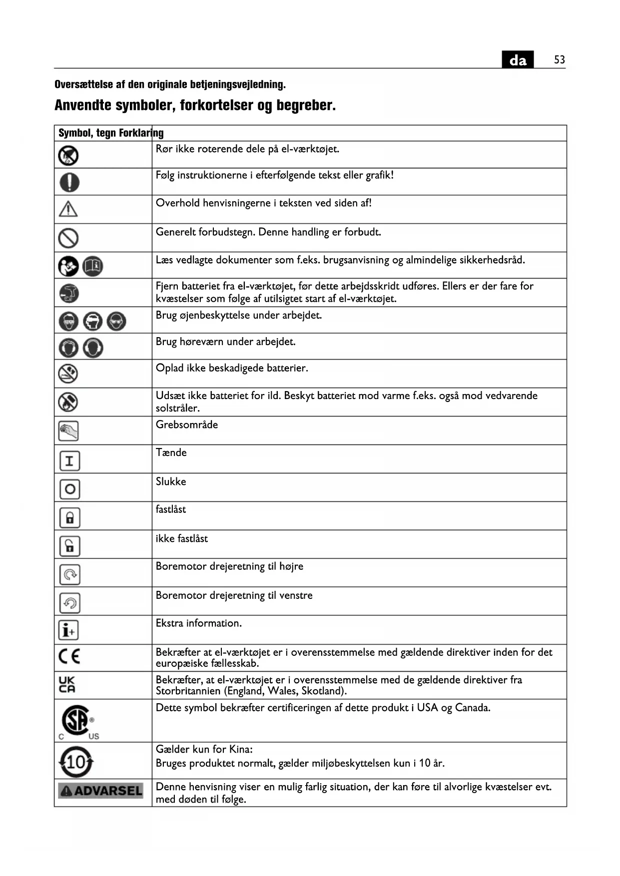 Oversættelse af den originale betjeningsvejledning. Anvendte symboler, forkortelser og begreber. Symbol, tegn Forklaring Rør ikke roterende dele på el-værktøjet. Følg instruktionerne i efterfølgende tekst eller grafik! Overhold henvisningerne i teksten ved siden af! Generelt forbudstegn. Denne handling er forbudt. Læs vedlagte dokumenter som f.eks. brugsanvisning og almindelige sikkerhedsråd. Fjern batteriet fra el-værktøjet, før dette arbejdsskridt udføres. Ellers er der fare for kvæstelser som følge af utilsigtet start af el-værktøjet. Brug øjenbeskyttelse under arbejdet. Brug høreværn under arbejdet. Oplad ikke beskadigede batterier. Udsæt ikke batteriet for ild. Beskyt batteriet mod varme f.eks. også mod vedvarende solstråler. Grebsområde Tænde Slukke fastlåst ikke fastlåst Boremotor drejeretning til højre Boremotor drejeretning til venstre Ekstra information. Bekræfter at el-værktøjet er i overensstemmelse med gældende direktiver inden for det europæiske fællesskab. Bekræfter, at el-værktøjet er i overensstemmelse med de gældende direktiver fra Storbritannien (England, Wales, Skotland). Dette symbol bekræfter certificeringen af dette produkt i USA og Canada. Gælder kun for Kina: Bruges produktet normalt, gælder miljøbeskyttelsen kun i 10 år. Denne henvisning viser en mulig farlig situation, der kan føre til alvorlige kvæstelser evt. med døden til følge.54