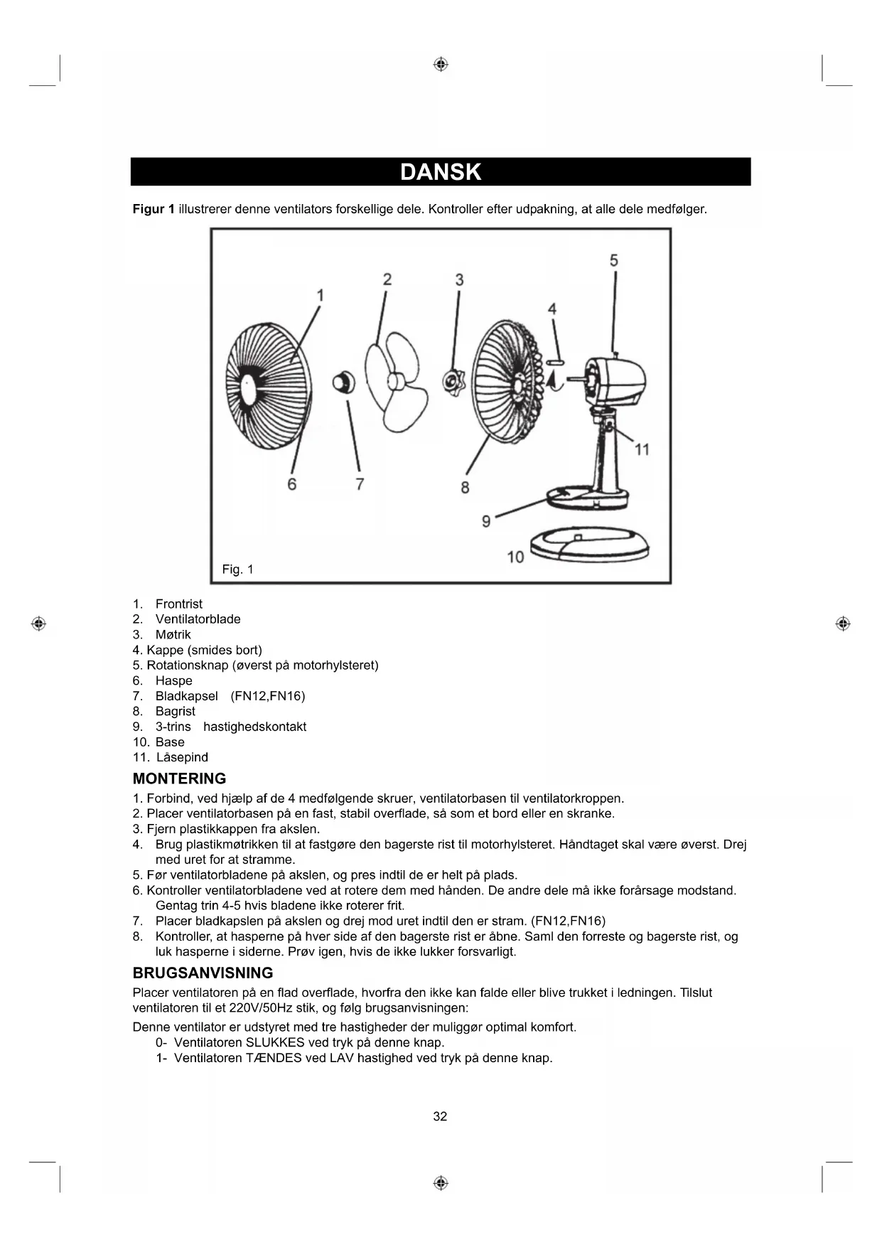 luk hasperne i siderne. Prøv igen, hvis de ikke lukker forsvarligt. BRUGSANVISNING Placer ventilatoren på en flad overflade, hvorfra den ikke kan falde eller blive trukket i ledningen. Tilslut ventilatoren til et 220V/50Hz stik, og følg brugsanvisningen: Denne ventilator er udstyret med tre hastigheder der muliggør optimal komfort.