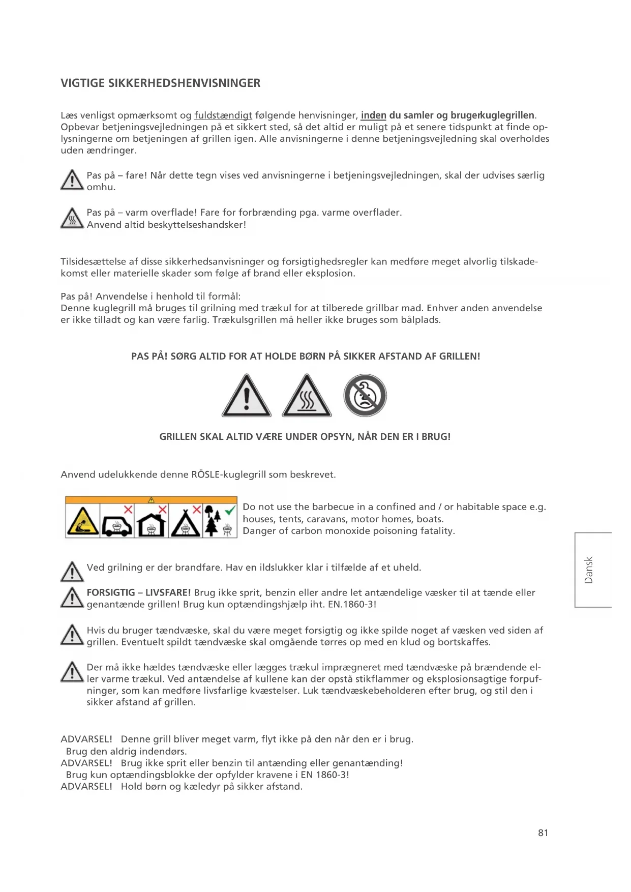 Piedra para pizza redonda, 41 cm 25075 Parrilla redonda, 40 cm81 Dansk VIGTIGE SIKKERHEDSHENVISNINGER Læs venligst opmærksomt og fuldstændigt følgende henvisninger, inden du samler og bruger kuglegrillen. Opbevar betjeningsvejledningen på et sikkert sted, så det altid er muligt på et senere tidspunkt at nde op- lysningerne om betjeningen af grillen igen. Alle anvisningerne i denne betjeningsvejledning skal overholdes uden ændringer. Pas på – fare! Når dette tegn vises ved anvisningerne i betjeningsvejledningen, skal der udvises særlig omhu. Pas på – varm overade! Fare for forbrænding pga. varme overader. Anvend altid beskyttelseshandsker! Tilsidesættelse af disse sikkerhedsanvisninger og forsigtighedsregler kan medføre meget alvorlig tilskade- komst eller materielle skader som følge af brand eller eksplosion. Pas på! Anvendelse i henhold til formål: Denne kuglegrill må bruges til grilning med trækul for at tilberede grillbar mad. Enhver anden anvendelse er ikke tilladt og kan være farlig. Trækulsgrillen må heller ikke bruges som bålplads. PAS PÅ! SØRG ALTID FOR AT HOLDE BØRN PÅ SIKKER AFSTAND AF GRILLEN! GRILLEN SKAL ALTID VÆRE UNDER OPSYN, NÅR DEN ER I BRUG! Anvend udelukkende denne RÖSLE-kuglegrill som beskrevet. Do not use the barbecue in a conned and / or habitable space e.g. houses, tents, caravans, motor homes, boats. Danger of carbon monoxide poisoning fatality. Ved grilning er der brandfare. Hav en ildslukker klar i tilfælde af et uheld. FORSIGTIG – LIVSFARE! Brug ikke sprit, benzin eller andre let antændelige væsker til at tænde eller genantænde grillen! Brug kun optændingshjælp iht. EN.1860-3! Hvis du bruger tændvæske, skal du være meget forsigtig og ikke spilde noget af væsken ved siden af grillen. Eventuelt spildt tændvæske skal omgående tørres op med en klud og bortskaffes. Der må ikke hældes tændvæske eller lægges trækul imprægneret med tændvæske på brændende el- ler varme trækul. Ved antændelse af kullene kan der opstå stikammer og eksplosionsagtige forpuf- ninger, som kan medføre livsfarlige kvæstelser. Luk tændvæskebeholderen efter brug, og stil den i sikker afstand af grillen. ADVARSEL! Denne grill bliver meget varm, yt ikke på den når den er i brug. Brug den aldrig indendørs. ADVARSEL! Brug ikke sprit eller benzin til antænding eller genantænding! Brug kun optændingsblokke der opfylder kravene i EN 1860-3! ADVARSEL! Hold børn og kæledyr på sikker afstand.82 Dansk PAS PÅ! Børn og husdyr må aldrig opholde sig i nærheden af grillen uden opsyn. PAS PÅ! Denne kuglegrill bliver meget varm og må ikke bevæges, når den er i brug. Andre vigtige farehenvisninger Grillen må ikke anvendes indendørs og i lukkede rum, fordi der her kan ansamles giftige gasser, som kan medføre alvorlig og endda livstruende tilskadekomst med dødelig udgang. Denne grill må udelukkende anvendes udendørs på et godt ventileret sted. Grillen må aldrig anven- des inde i garager, i bygninger, i forbindelsesgange mellem bygninger eller på steder, som på anden vis er omgivet af bygningsdele. Brug aldrig grillen under brændbare tage, halvtage osv.