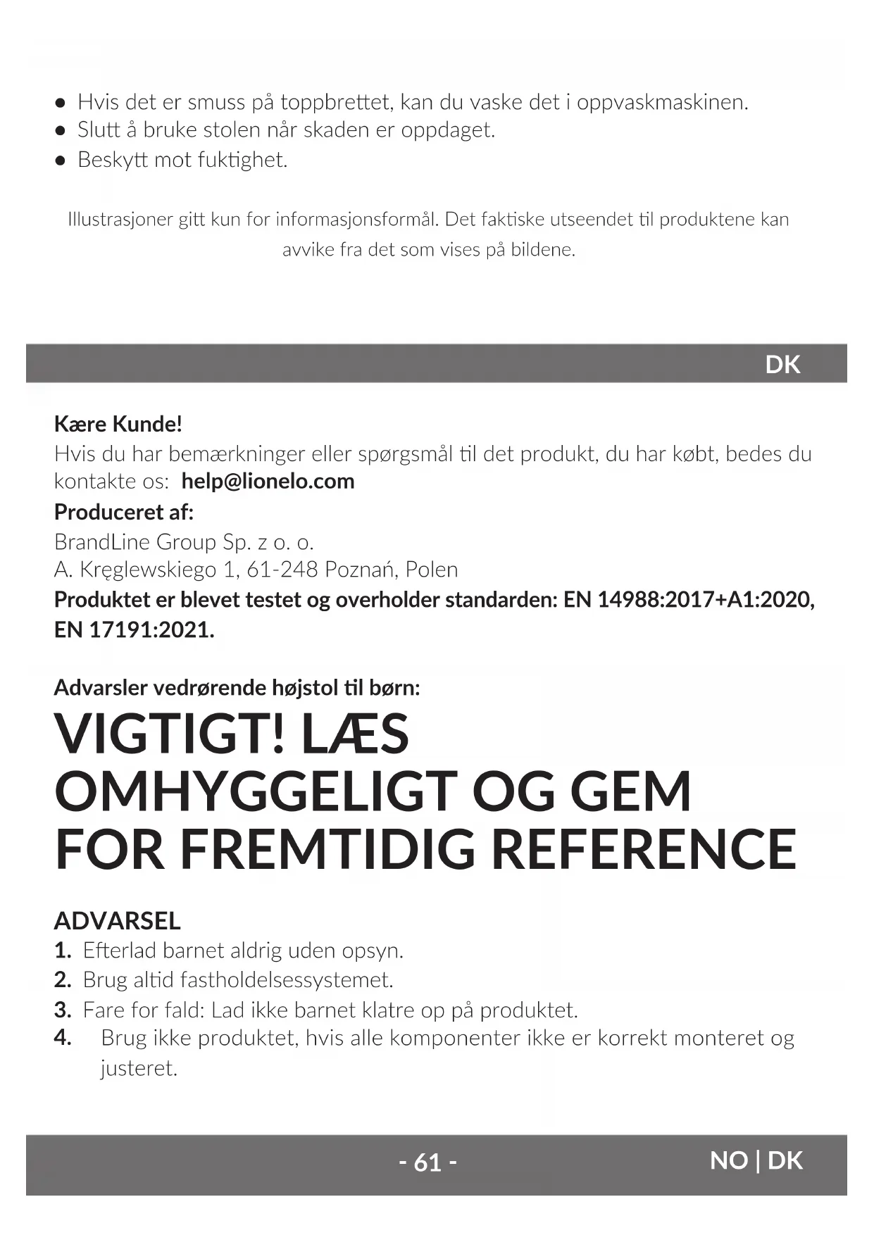 Kære Kunde! Hvis du har bemærkninger eller spørgsmål l det produkt, du har købt, bedes du kontakte os: help@lionelo.com Produceret af: BrandLine Group Sp. z o. o. A. Kręglewskiego 1, 61-248 Poznań, Polen Produktet er blevet testet og overholder standarden: EN 14988:2017+A1:2020, EN 17191:2021. Advarsler vedrørende højstol l børn: