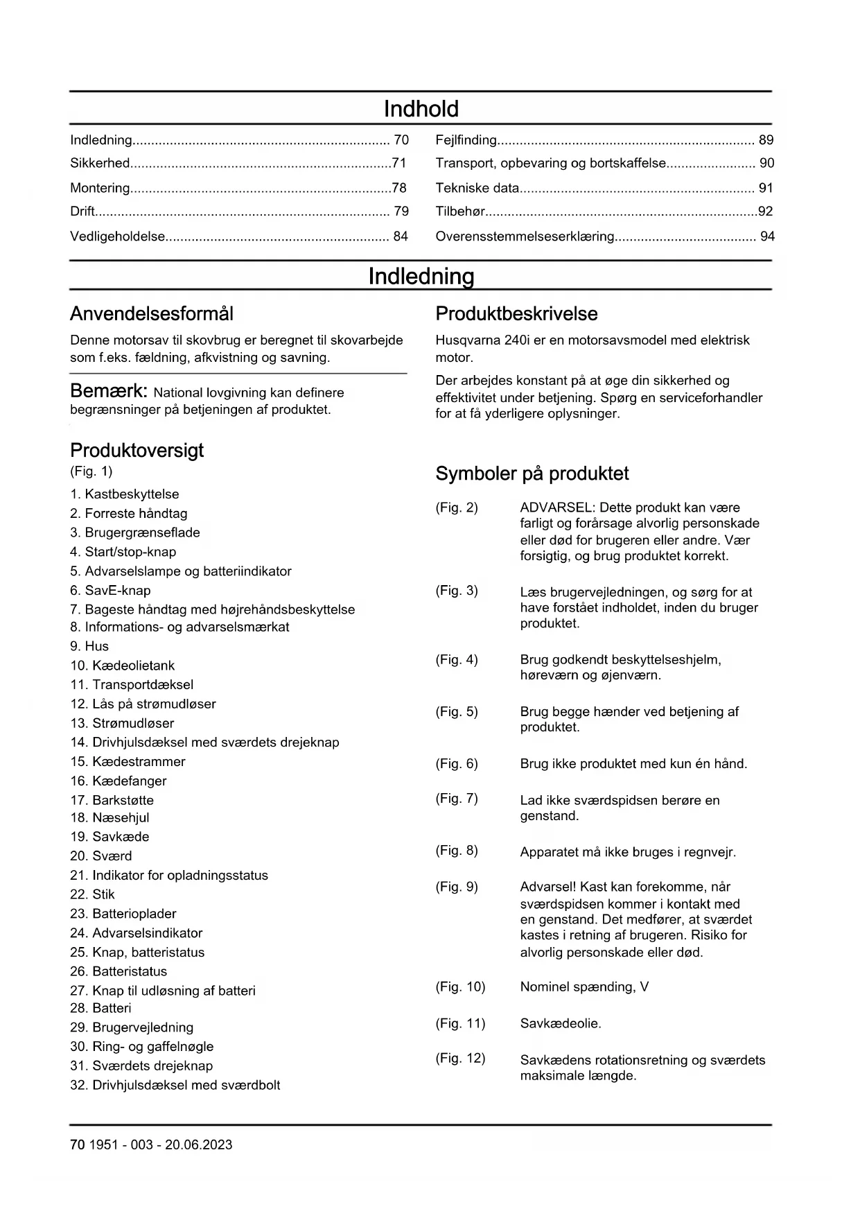 Symboler på produktet (Fig. 2) ADVARSEL: Dette produkt kan være farligt og forårsage alvorlig personskade eller død for brugeren eller andre. Vær forsigtig, og brug produktet korrekt. (Fig. 3) Læs brugervejledningen, og sørg for at have forstået indholdet, inden du bruger produktet. (Fig. 4) Brug godkendt beskyttelseshjelm, høreværn og øjenværn. (Fig. 5) Brug begge hænder ved betjening af produktet. (Fig. 6) Brug ikke produktet med kun én hånd. (Fig. 7) Lad ikke sværdspidsen berøre en genstand. (Fig. 8) Apparatet må ikke bruges i regnvejr. (Fig. 9) Advarsel! Kast kan forekomme, når sværdspidsen kommer i kontakt med en genstand. Det medfører, at sværdet kastes i retning af brugeren. Risiko for alvorlig personskade eller død. (Fig. 10) Nominel spænding, V (Fig. 11) Savkædeolie. (Fig. 12) Savkædens rotationsretning og sværdets maksimale længde. 70 1951 - 003 - 20.06.2023(Fig. 13) Jævnstrøm. (Fig. 21) Kædebremse, aktiveret (fremad). Kædebremse, deaktiveret (baglæns). (Fig. 22) Kædens retning. (Fig. 23) Typeskiltet viser serienum- meret. yyyy er produktions- året, ww er produktions- ugen. Bemærk: Andre symboler/mærkater på produktet henviser til certificeringskrav på visse markeder. Symboler på batteriet og/eller på batteriopladeren (Fig. 24) Aflever produktet på en gen- brugsstation for elektrisk og elektronisk udstyr. (Gælder kun Europa) (Fig. 14) Miljømærke. Produktet og produktemballagen er ikke almindeligt husholdningsaffald. Aflever det på en godkendt genbrugsstation til elektrisk og elektronisk udstyr. (Fig. 15) Produktet overholder gældende EU- direktiver. (Fig. 16) Dette produkt overholder gældende UK- direktiver. (Fig. 17) Mærkat vedrørende emission af støj til omgivelserne i henhold til EU-direktiv 2000/14/EF, direktiver og regulativer i Storbritannien og New South Wales' lovgivning om "Beskyttelse af miljøet (støjbegrænsning) forordning 2017". Produktets garanterede lydeffektniveau er angivet i Tekniske data på side 91 og på mærkaten. (Fig. 18) Fejlsikker transformer. (Fig. 19) Brug og opbevar kun batteriopladeren indendørs. (Fig. 20) Dobbelt isolering. Producent Husqvarna AB Drottninggatan 2, SE-561 82, Huskvarna, Sweden, tel: +46-36-146500 Produktansvar Som nævnt i produktansvarsbestemmelserne hæfter vi ikke for skader forårsaget af vores produkt, hvis: