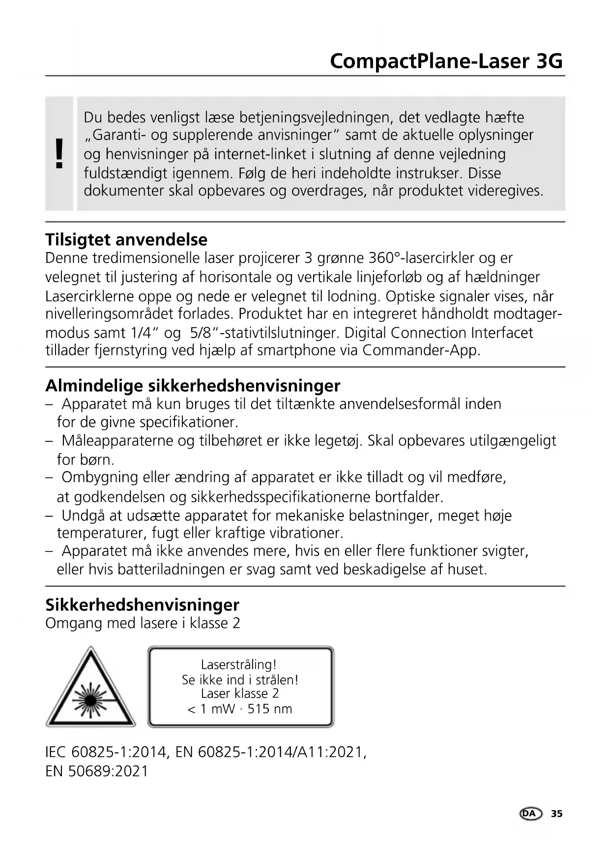 Tilsigtet anvendelse Denne tredimensionelle laser projicerer 3 grønne 360°-lasercirkler og er velegnet til justering af horisontale og vertikale linjeforløb og af hældninger Lasercirklerne oppe og nede er velegnet til lodning. Optiske signaler vises, når nivelleringsområdet forlades. Produktet har en integreret håndholdt modtager- modus samt 1/4“ og 5/8“-stativtilslutninger. Digital Connection Interfacet tillader fjernstyring ved hjælp af smartphone via Commander-App. Almindelige sikkerhedshenvisninger – Apparatet må kun bruges til det tiltænkte anvendelsesformål inden for de givne specikationer. – Måleapparaterne og tilbehøret er ikke legetøj. Skal opbevares utilgængeligt for børn. – Ombygning eller ændring af apparatet er ikke tilladt og vil medføre, at godkendelsen og sikkerhedsspecikationerne bortfalder. – Undgå at udsætte apparatet for mekaniske belastninger, meget høje temperaturer, fugt eller kraftige vibrationer. – Apparatet må ikke anvendes mere, hvis en eller ere funktioner svigter, eller hvis batteriladningen er svag samt ved beskadigelse af huset. Sikkerhedshenvisninger Omgang med lasere i klasse 2