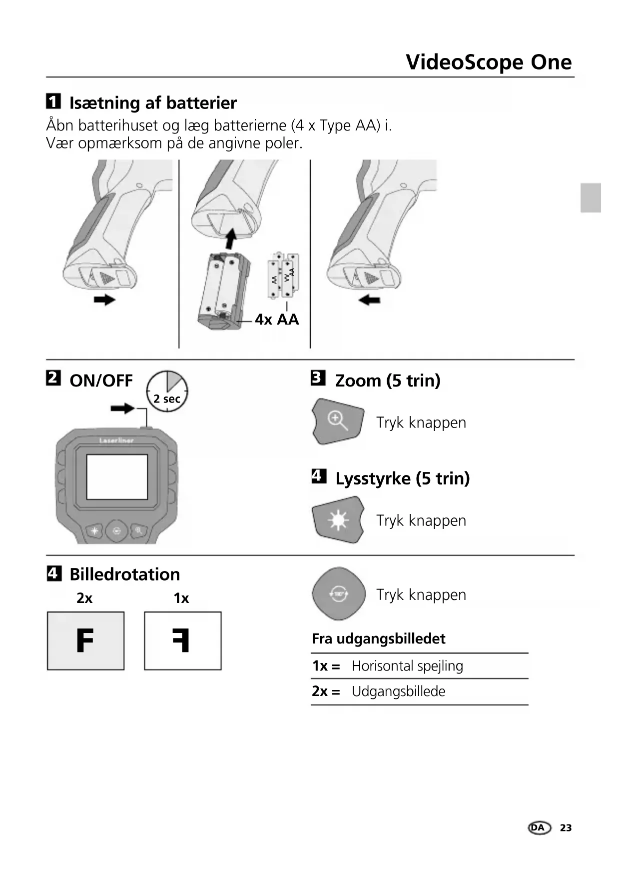 1x2x 1x = Horisontal spejling2x = UdgangsbilledeFra udgangsbilledet Tryk knappen Tryk knappen Tryk knappen Zoom (5 trin) Lysstyrke (5 trin) Billedrotation ON/OFF Åbn batterihuset og læg batterierne (4 x Type AA) i. Vær opmærksom på de angivne poler. Isætning af batterier DA24