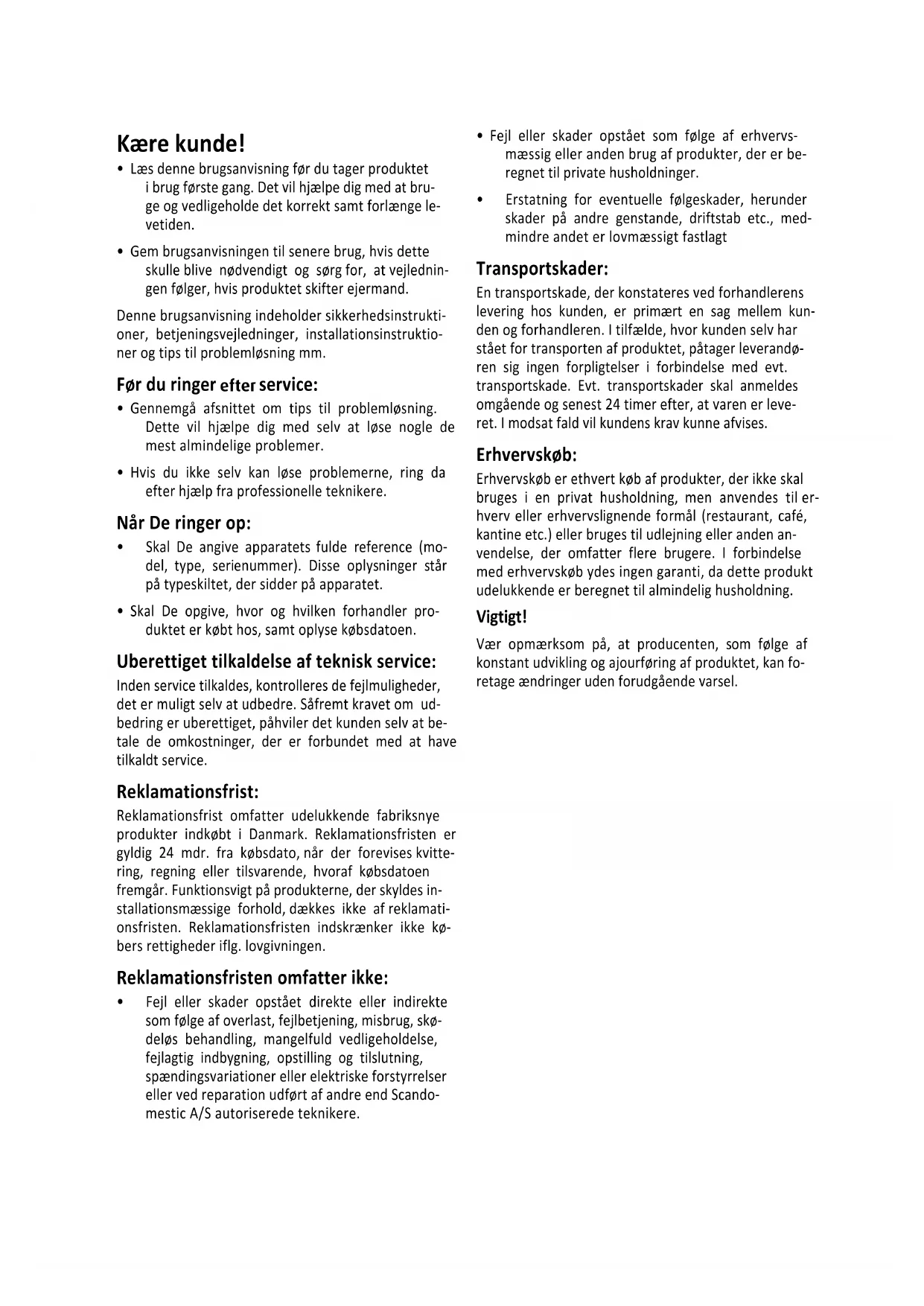 Fejl eller skader opstæt direkte aller indirekte som følgæ af overlast, fejlbetjening, misbrug, skødeløs带走hing, mangelfuld vedligeholdelse, fejlagtg indbygnning, opstilling og tilslutning, spændingsvariationer aller elektriske forstyrelser aller ved reparation udfør af andre end Scandomestic A/S autoriserede teknikere.