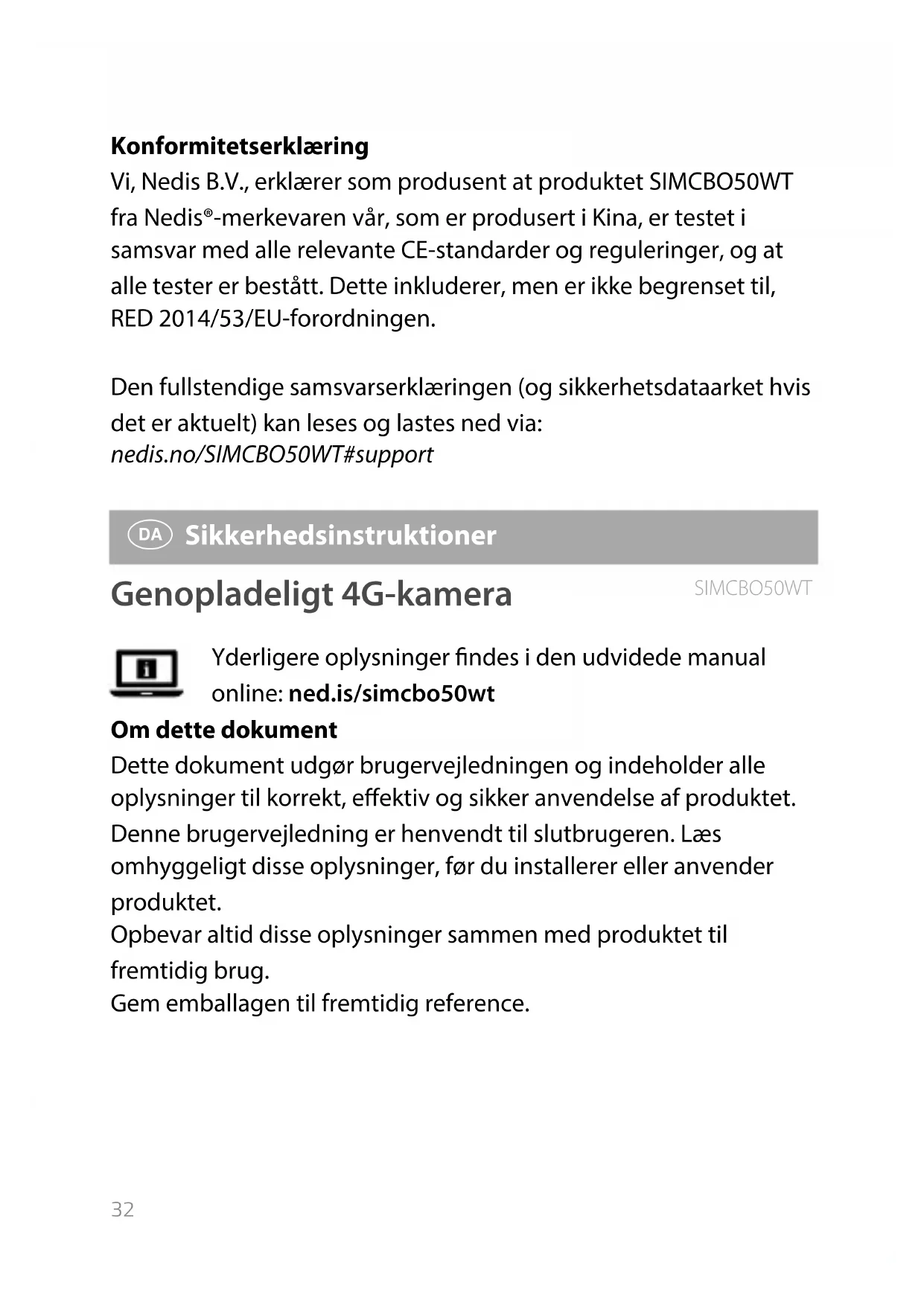 Sikkerhedsinstruktioner Genopladeligt 4G-kamera SIMCBO50WT Yderligere oplysninger ndes i den udvidede manual online: ned.is/simcbo50wt Om dette dokument Dette dokument udgør brugervejledningen og indeholder alle oplysninger til korrekt, eektiv og sikker anvendelse af produktet. Denne brugervejledning er henvendt til slutbrugeren. Læs omhyggeligt disse oplysninger, før du installerer eller anvender produktet. Opbevar altid disse oplysninger sammen med produktet til fremtidig brug. Gem emballagen til fremtidig reference.33Nedis® SmartLife | Safety instructions Anvendte symboler