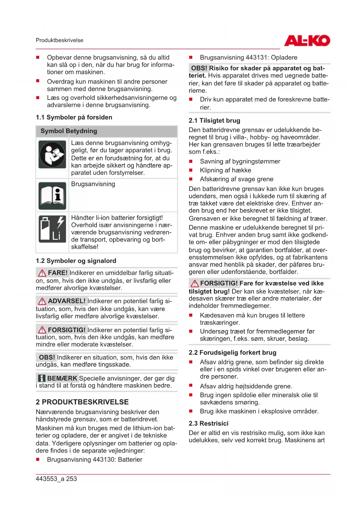 FARE! Indikerer en umiddelbar farlig situati- on, som, hvis den ikke undgås, er livsfarlig eller medfører alvorlige kvæstelser. ADVARSEL! Indikerer en potentiel farlig si- tuation, som, hvis den ikke undgås, kan være livsfarlig eller medføre alvorlige kvæstelser. FORSIGTIG! Indikerer en potentiel farlig si- tuation, som, hvis den ikke undgås, kan medføre mindre eller moderate kvæstelser. OBS! Indikerer en situation, som, hvis den ikke undgås, kan medføre tingsskade. BEMÆRK Specielle anvisninger, der gør dig i stand til at forstå og håndtere maskinen bedre. 2 PRODUKTBESKRIVELSE Nærværende brugsanvisning beskriver den håndstyrede grensav, som er batteridrevet. Maskinen må kun bruges med de lithium-ion bat- terier og opladere, der er angivet i de tekniske data. Yderligere oplysninger om batterier og opla- dere findes i de separate vejledninger: