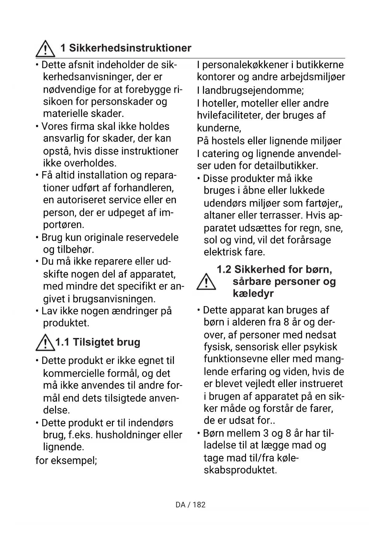 SVDA / 204DA / 205 ANSVARSFRASKRIVELSE Nogle (enkle) fejl kan i tilstrækkelig grad håndteres af slutbrugeren uden sikkerheds- problemer eller usikker anvendelse, forud- sat at de udføres inden for grænserne og i overensstemmelse med følgende in- struktioner (se afsnittet "Selvreparation"). Derfor medmindre andet er tilladt i afsnittet “Selvreparation” nedenfor, skal reparationer rettes til registrerede professionelle repara- tører for at undgå sikkerhedsproblemer. En registreret professionel reparatør er en pro- fessionel reparatør, som producenten har givet adgang til listen over instruktioner og reservedele til dette produkt i henhold til metoderne beskrevet i lovgivningsmæssige retsakter i henhold til direktiv 2009/125/EF. Imidlertid er det kun serviceagenten (dvs. autoriserede professionelle reparatører), som du kan nå gennem det telefonnum- mer, der er angivet i brugervejledningen/ garantikortet eller gennem din autorisere- de forhandler, der kan levere service under garantibetingelserne. Vær derfor opmærk- som på, at reparationer udført af profes- sionelle reparatører (som ikke er godkendt af , annullerer garantien. Selvreparation Selvreparation kan udføres af slutbrugeren med hensyn til følgende reservedele: dør- håndtag, dørhængsler, bakker, kurve og dør- tætninger (en opdateret liste er også til- gængelig på pr. 1. marts 2021 For at sikre produktsikkerhed og for at for- hindre risiko for alvorlig personskade skal den nævnte selvreparation desuden ud- føres efter instruktionerne i brugervejlednin- gen til selvreparation, eller som findes på Af hensyn til din sikkerhed skal du trække stikket ud af produktet, inden du prøver selvreparation. Slutbrugeres reparations- og reparations- forsøg på dele, der ikke er med på en sådan liste og/eller ikke følger instruktionerne i brugervejledningerne til selvreparation, eller som findes på , kan give anledning til sik- kerhedsproblemer, der ikke kan henføres til og annullerer produktets garanti. Derfor anbefales det stærkt, at slutbrugere afstår fra forsøget på at udføre reparatio- ner, der falder uden for den nævnte liste over reservedele, og i sådanne tilfælde kon- takter autoriserede professionelle reparatø- rer eller registrerede professionelle repara- tører. Tværtimod kan sådanne forsøg fra slutbrugere medføre sikkerhedsproblemer og beskadige produktet og derefter forår- sage brand, oversvømmelse, elektrisk stød og alvorlig personskade. Som eksempel, men ikke begrænset til det- te, skal følgende reparationer rettes til auto- riserede professionelle reparatører eller re- gistrerede professionelle reparatører: mo- tor, pumpesamling, hovedkort, motorkort, displaykort, varmelegemer osv. Producenten/sælgeren kan ikke holdes an- svarlig i tilfælde, hvor slutbrugerne ikke overholder ovenstående. Tilgængeligheden af reservedele til det kø- leskab, som du har købt er 10 år. I denne periode vil originale reservedele være til- gængelige til at bruge køleskabet korrekt. Garantiens minimumsvarighed for køleska- bet, som du har købt, er 24 måneder. Dette produkt indeholder en lyskilde med energiklasse 'G'. Lyskilden i dette produkt må kun udskiftes af en professionel reparatør Se også