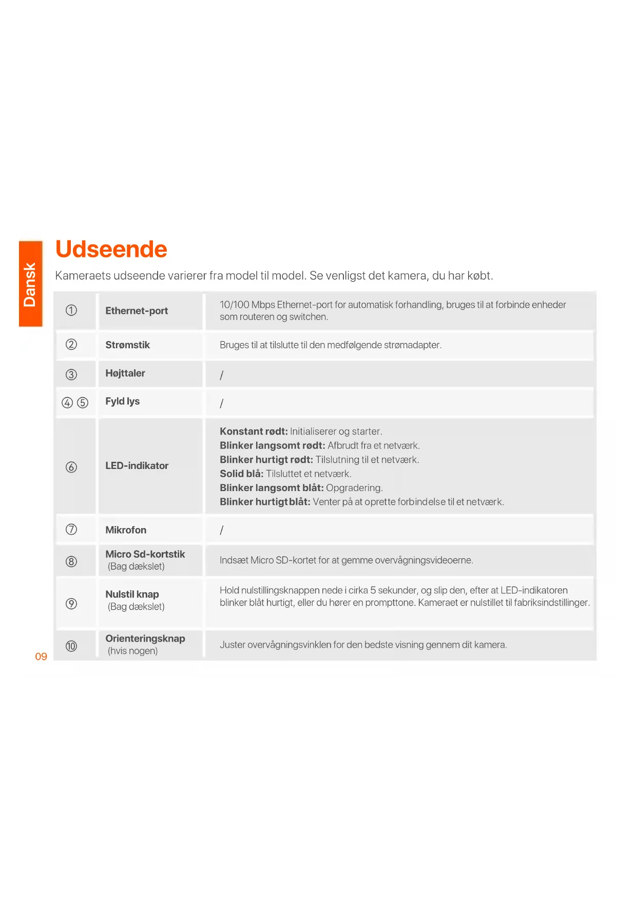 Bruges til at tilslutte til den medfølgende strømadapter. 10/100 Mbps Ethernet-port for automatisk forhandling, bruges til at forbinde enheder som routeren og switchen. Konstant rødt: Initialiserer og starter. Blinker langsomt rødt: Afbrudt fra et netværk. Blinker hurtigt rødt: Tilslutning til et netværk. Solid blå: Tilsluttet et netværk. Blinker langsomt blåt: Opgradering. Blinker hurtigt blåt: Venter på at oprette forbindelse til et netværk. Indsæt Micro SD-kortet for at gemme overvågningsvideoerne. Hold nulstillingsknappen nede i cirka 5 sekunder, og slip den, efter at LED-indikatoren blinker blåt hurtigt, eller du hører en prompttone. Kameraet er nulstillet til fabriksindstillinger. Juster overvågningsvinklen for den bedste visning gennem dit kamera. Fyld lys LED-indikator Mikrofon Højttaler