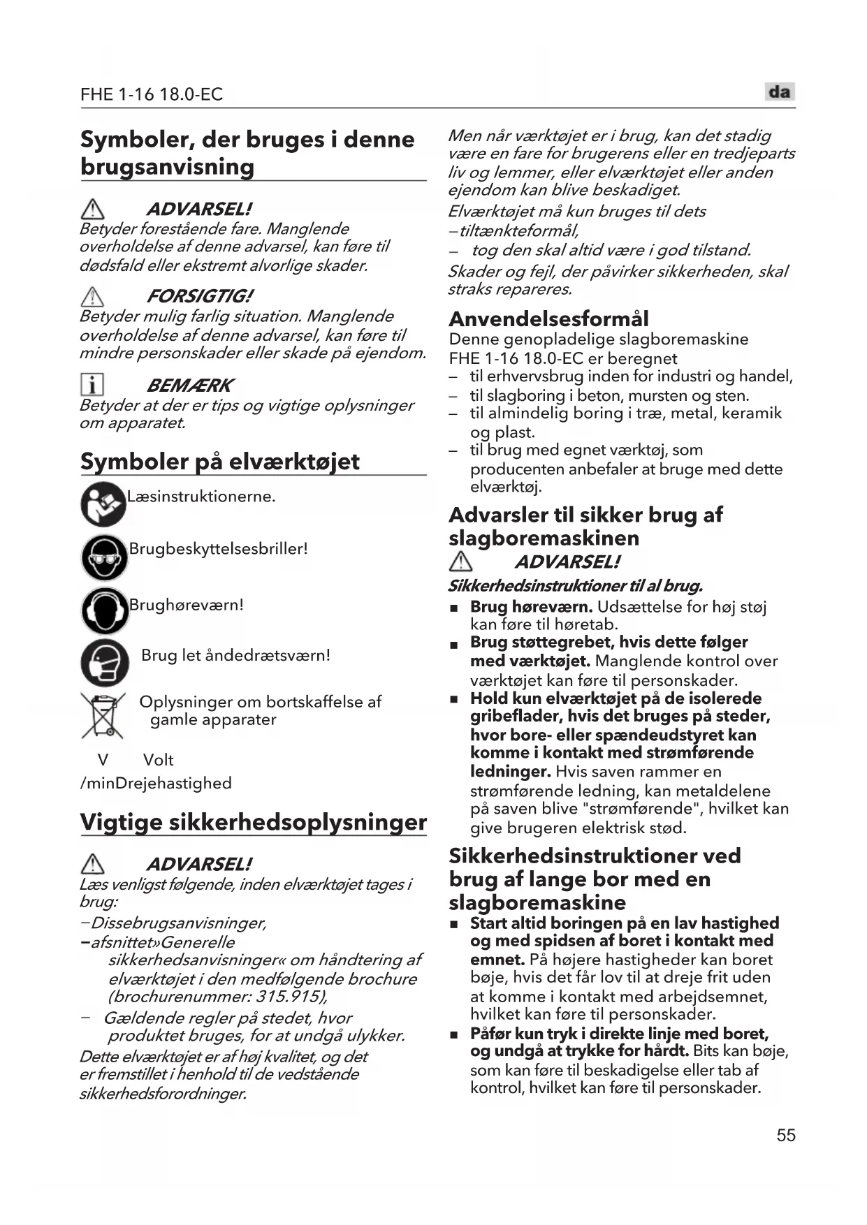 Symboler, der bruges i denne brugsanvisning ADVARSEL! Betyder forestående fare. Manglende overholdelse af denne advarsel, kan føre til dødsfald eller ekstremt alvorlige skader. FORSIGTIG! Betyder mulig farlig situation. Manglende overholdelse af denne advarsel, kan føre til mindre personskader eller skade på ejendom. BEMÆRK Betyder at der er tips og vigtige oplysninger om apparatet. Symboler på elværktøjet Læs instruktionerne. Brug beskyttelsesbriller! Brug høreværn! Brug let åndedrætsværn! Oplysninger om bortskaffelse af gamle apparater V Volt /min Drejehastighed Vigtige sikkerhedsoplysninger ADVARSEL! Læs venligst følgende, inden elværktøjet tages i brug: Disse brugsanvisninger, afsnittet »Generelle sikkerhedsanvisninger« om håndtering af elværktøjet i den medfølgende brochure (brochurenummer: 315.915), Gældende regler på stedet, hvor produktet bruges, for at undgå ulykker.Dette elværktøjet er af høj kvalitet, og det er fremstillet i henhold til de vedstående sikkerhedsforordninger.Men når værktøjet er i brug, kan det stadig være en fare for brugerens eller en tredjeparts liv og lemmer, eller elværktøjet eller anden ejendom kan blive beskadiget.Elværktøjet må kun bruges til dets tiltænkte formål, tog den skal altid være i god tilstand.Skader og fejl, der påvirker sikkerheden, skal straks repareres. Anvendelsesformål Denne genopladelige slagboremaskine FHE 1-16 18.0-EC er beregnet