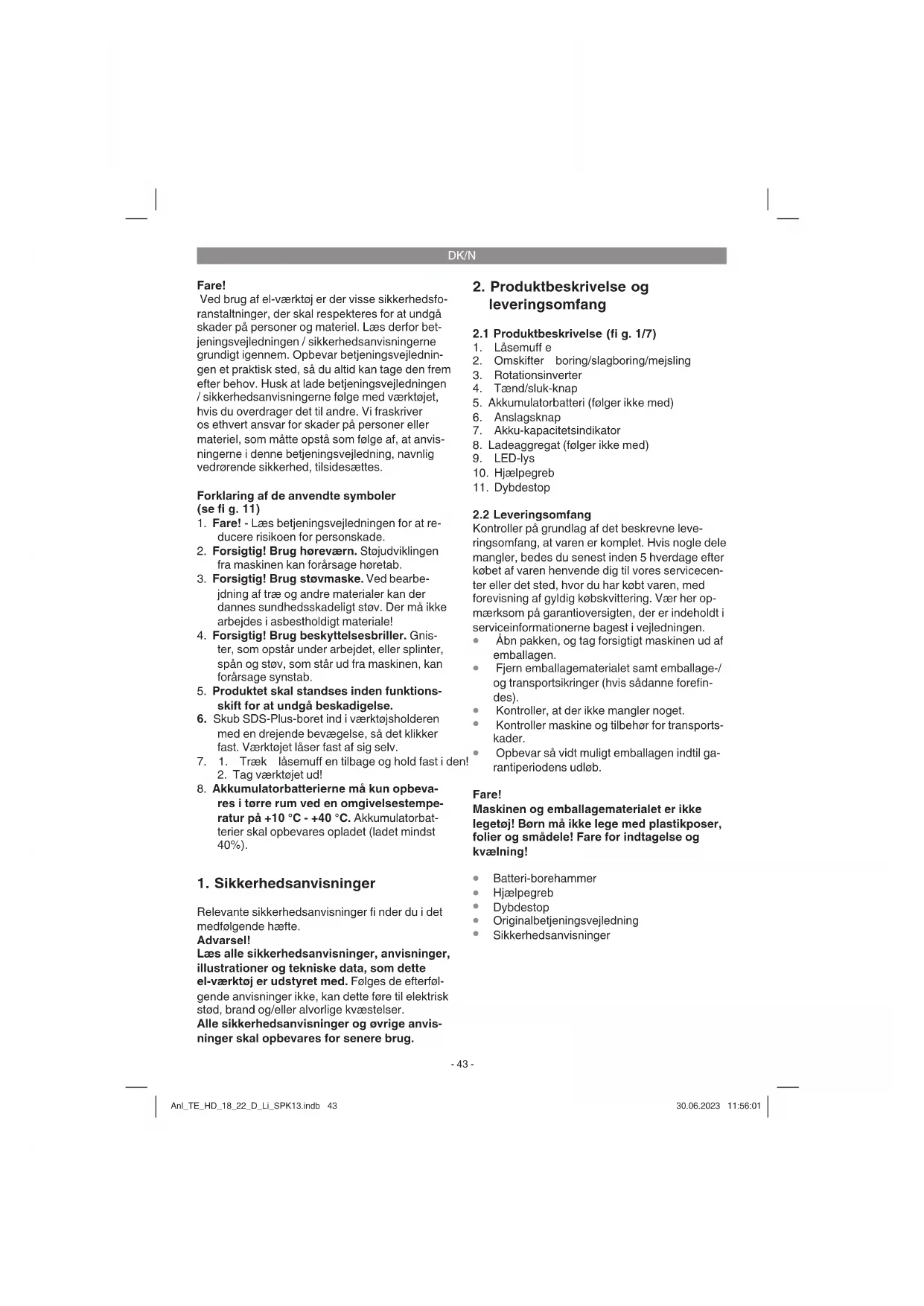 vibration, såfremt værktøjet benyttes over et længere tidsrum eller ikke håndteres og vedli- geholdes forskriftsmæssigt. Anl_TE_HD_18_22_D_Li_SPK13.indb 44Anl_TE_HD_18_22_D_Li_SPK13.indb 44 30.06.2023 11:56:0230.06.2023 11:56:02DK/N