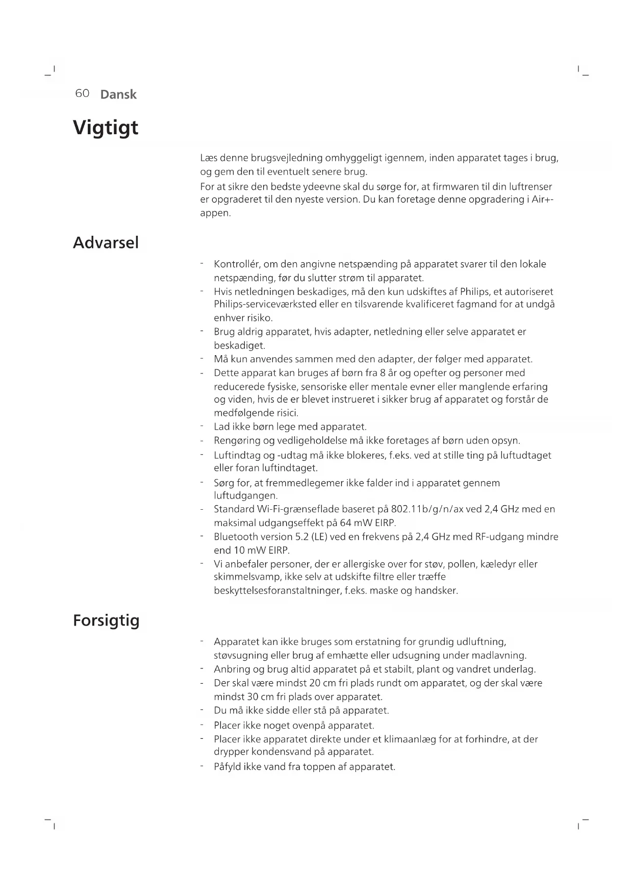 Dansk Vigtigt Læs denne brugsvejledning omhyggeligt igennem, inden apparatet tages i brug, og gem den til eventuelt senere brug. For at sikre den bedste ydeevne skal du sørge for, at firmwaren til din luftrenser er opgraderet til den nyeste version. Du kan foretage denne opgradering i Air+- appen. Advarsel