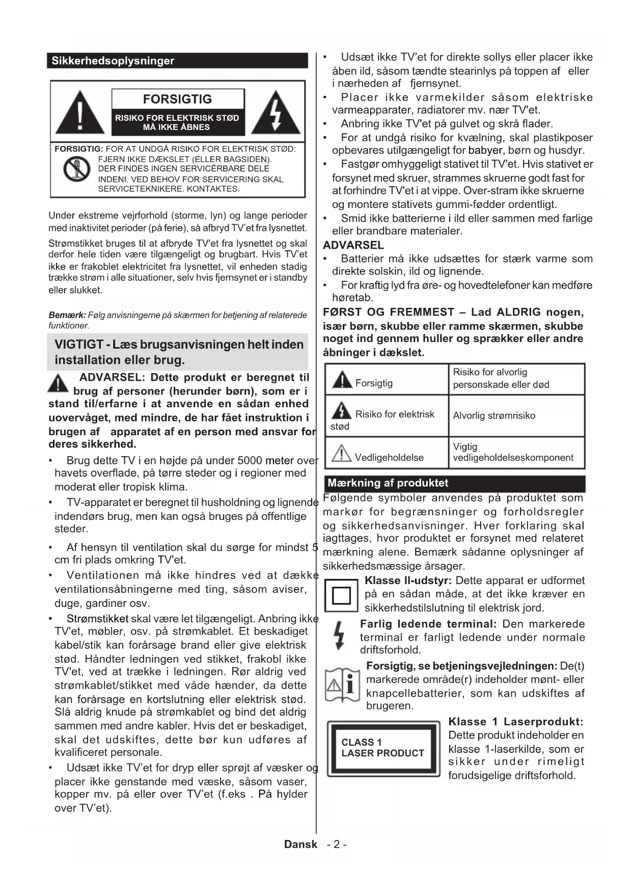 - Udstyretpasserkuntilmonteringihøjderpå≤2m. Hvis dit nuværende TV er ved at blive afmonteret og flyttet, bør de samme overvejelser som ovenfor anvendes. – – – – – – – – – – – – Apparater forbundet til bygningsinstallationernes beskyttende jordforbindelse gennem LYSNETTET eller gennem andet apparat med beskyttende jordfor