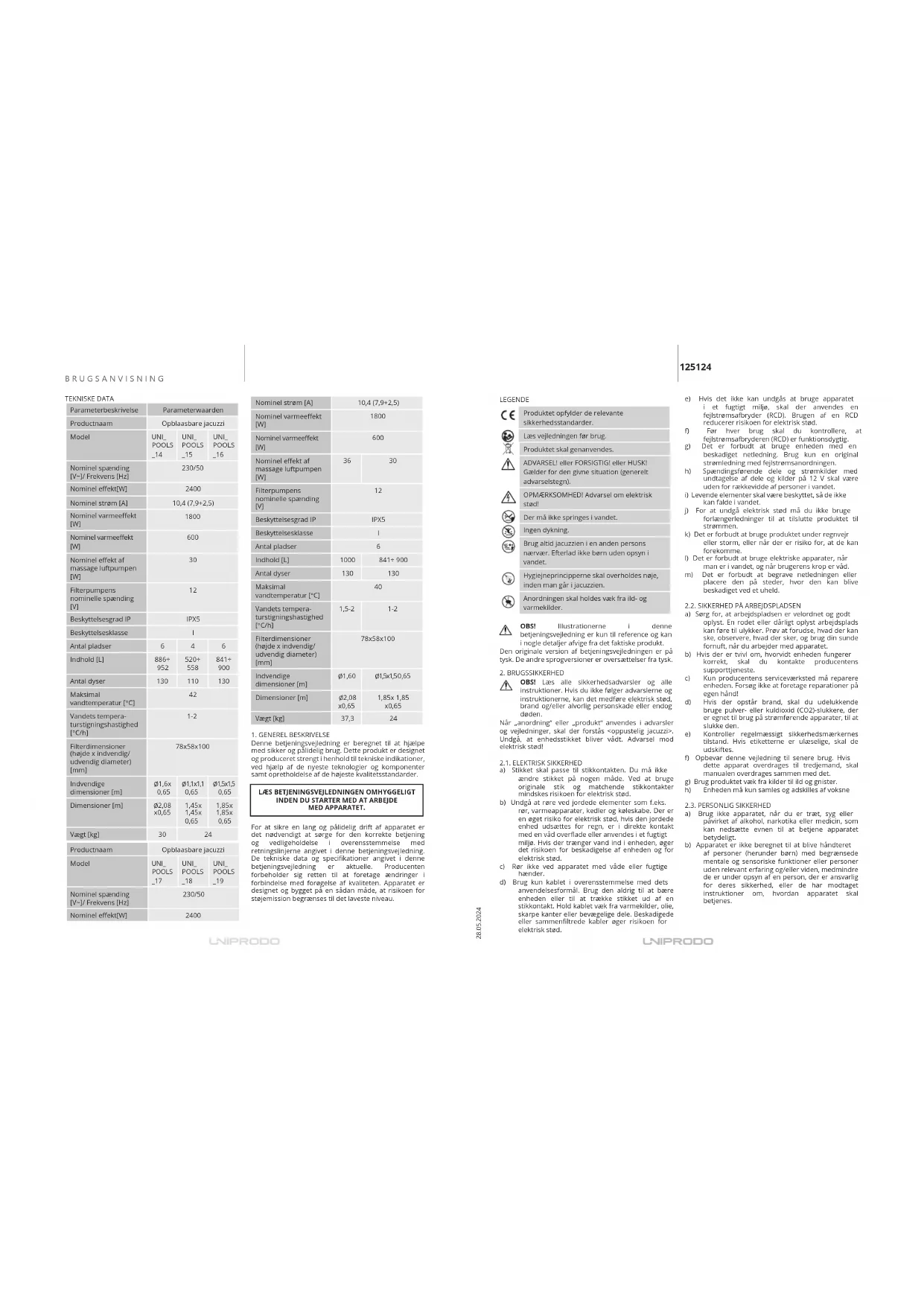 a) Sørg for, at arbejdspladsen er velordnet og godt oplyst. En rodet eller dårligt oplyst arbejdsplads kan føre til ulykker. Prøv at forudse, hvad der kan ske, observere, hvad der sker, og brug din sunde fornuft, når du arbejder med apparatet. b) Hvis der er tvivl om, hvorvidt enheden fungerer korrekt, skal du kontakte producentens supporttjeneste. c) Kun producentens serviceværksted må reparere enheden. Forsøg ikke at foretage reparationer på egen hånd! d) Hvis der opstår brand, skal du udelukkende bruge pulver- eller kuldioxid (CO2)-slukkere, der er egnet til brug på strømførende apparater, til at slukke den. e) Kontroller regelmæssigt sikkerhedsmærkernes tilstand. Hvis etiketterne er ulæselige, skal de udskiftes. f) Opbevar denne vejledning til senere brug. Hvis dette apparat overdrages til tredjemand, skal manualen overdrages sammen med det. g) Brug produktet væk fra kilder til ild og gnister. h) Enheden må kun samles og adskilles af voksne 2.3. PERSONLIG SIKKERHED a) Brug ikke apparatet, når du er træt, syg eller påvirket af alkohol, narkotika eller medicin, som kan nedsætte evnen til at betjene apparatet betydeligt. b) Apparatet er ikke beregnet til at blive håndteret af personer (herunder børn) med begrænsede mentale og sensoriske funktioner eller personer uden relevant erfaring og/eller viden, medmindre de er under opsyn af en person, der er ansvarlig for deres sikkerhed, eller de har modtaget instruktioner om, hvordan apparatet skal betjenes. Produktet skal genanvendes. LEGENDE Produktet opfylder de relevante sikkerhedsstandarder. Læs vejledningen før brug. Parameterbeskrivelse Parameterwaarden Productnaam Opblaasbare jacuzzi Model UNI_ POOLS _14 UNI_ POOLS _15 UNI_ POOLS _16 Nominel spænding [V~]/ Frekvens [Hz] 230/50 Nominel eekt[W] 2400 Nominel strøm [A] 10,4 (7,9+2,5) Nominel varmeeekt [W]