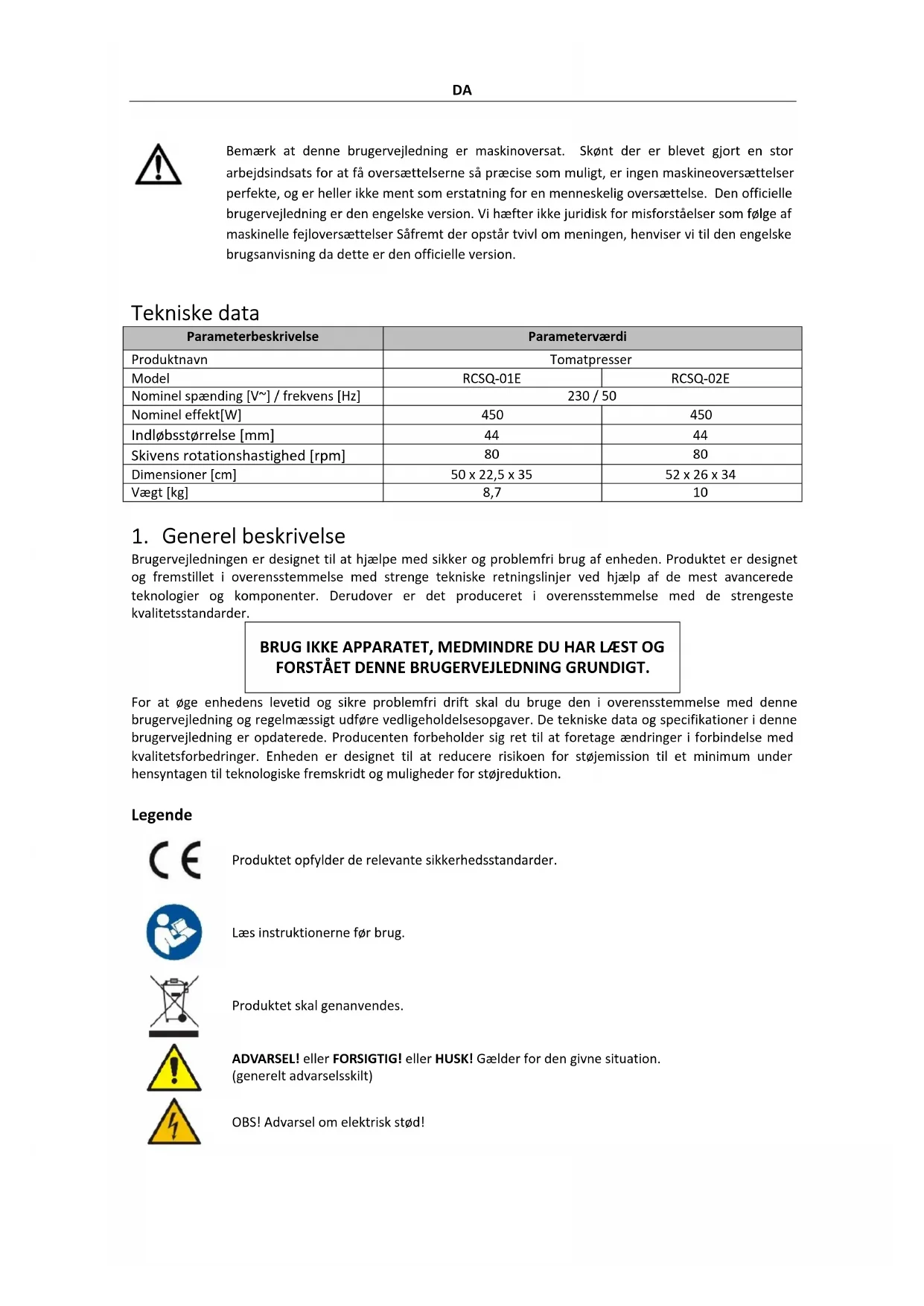 Udtrykkene "enhed" eller "produkt" bruges i advarslerne og instruktionerne til at henvise til: Tomatpresser 2.1. Elektrisk sikkerhed a) Stikket skal passe til stikkontakten. Du må ikke ændre stikket på nogen måde. Brug af originale stik og matchende stikkontakter reducerer risikoen for elektrisk stød. b) Undgå at røre ved jordforbundne elementer som rør, varmeapparater, kedler og køleskabe. Der er en øget risiko for elektrisk stød, hvis den jordede enhed udsættes for regn, kommer i direkte kontakt med en våd overflade eller fungerer i et fugtigt miljø. Hvis der kommer vand ind i apparatet, øges risikoen for skader på apparatet og for elektrisk stød. c) Rør ikke ved apparatet med våde eller fugtige hænder. d) Brug kun kablet til det formål, det er beregnet til. Brug den aldrig til at bære apparatet eller til at trække stikket ud af en stikkontakt. Hold kablet væk fra varmekilder, olie, skarpe kanter eller bevægelige dele. Beskadigede eller sammenfiltrede kabler øger risikoen for elektrisk stød. e) Hvis det ikke kan undgås at bruge enheden i et fugtigt miljø, skal der anvendes en fejlstrømsafbryder (RCD). Brug af en fejlstrømsafbryder reducerer risikoen for elektrisk stød. f) Brug ikke apparatet, hvis netledningen er beskadiget eller viser tydelige tegn på slitage. En beskadiget netledning skal udskiftes af en kvalificeret elektriker eller producentens servicecenter. g) For at undgå elektrisk stød må ledningen, stikket eller apparatet ikke nedsænkes i vand eller andre væsker. Brug ikke apparatet på våde overflader. h) OBS! LIVSFARE! Nedsænk aldrig apparatet i vand eller andre væsker under rengøringen.