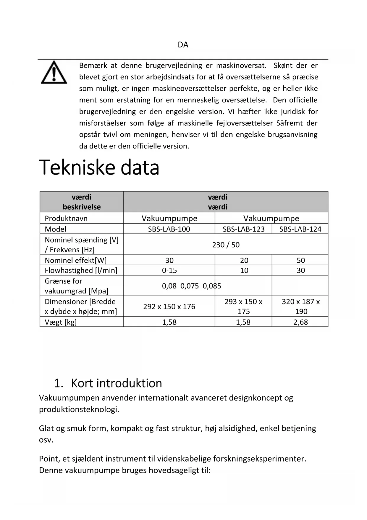 Bemærk at denne brugervejledning er maskinoversat. Skønt der er blevet gjort en stor arbejdsindsats for at få oversættelserne så præcise som muligt, er ingen maskineoversættelser perfekte, og er heller ikke ment som erstatning for en menneskelig oversættelse. Den officielle brugervejledning er den engelske version. Vi hæfter ikke juridisk for misforståelser som følge af maskinelle fejloversættelser Såfremt der opstår tvivl om meningen, henviser vi til den engelske brugsanvisning da dette er den officielle version. Tekniske data værdi beskrivelse værdi værdi Produktnavn Vakuumpumpe Vakuumpumpe Model SBS-LAB-100 SBS-LAB-123 SBS-LAB-124 Nominel spænding [V] / Frekvens [Hz] 230 / 50 Nominel effekt[W]