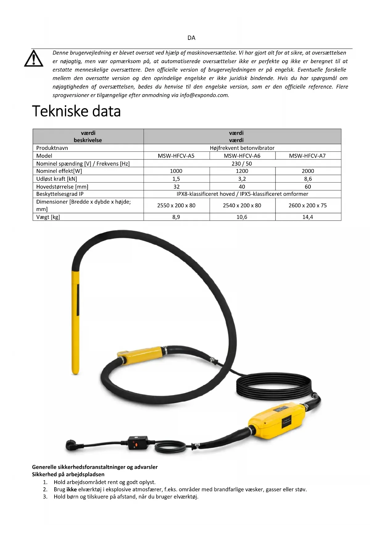 Denne brugervejledning er blevet oversat ved hjælp af maskinoversættelse. Vi har gjort alt for at sikre, at oversættelsen er nøjagtig, men vær opmærksom på, at automatiserede oversættelser ikke er perfekte og ikke er beregnet til at erstatte menneskelige oversættere. Den officielle version af brugervejledningen er på engelsk. Eventuelle forskelle mellem den oversatte version og den oprindelige engelske er ikke juridisk bindende. Hvis du har spørgsmål om nøjagtigheden af oversættelsen, bedes du henvise til den engelske version, som er den officielle reference. Flere sprogversioner er tilgængelige efter anmodning via info@expondo.com. Tekniske data værdi beskrivelse værdi værdi Produktnavn Højfrekvent betonvibrator Model MSW-HFCV-A5 MSW-HFCV-A6 MSW-HFCV-A7 Nominel spænding [V] / Frekvens [Hz] 230 / 50 Nominel effekt[W]