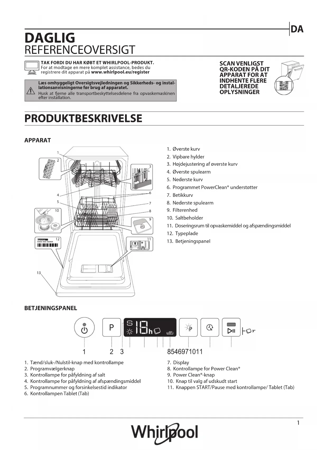 DAGLIG REFERENCEOVERSIGT PRODUKTBESKRIVELSE APPARATBETJENINGSPANEL1. Tænd/sluk-/Nulstil-knap med kontrollampe2. Programvælgerknap3. Kontrollampe for påfyldning af salt4. Kontrollampe for påfyldning af afspændingsmiddel5. Programnummer og forsinkelsestid indikator6. Kontrollampen Tablet (Tab) 7. Display8. Kontrollampe for Power Clean®9. Power Clean®-knap10. Knap til valg af udskudt start11. Knappen START/Pause med kontrollampe/ Tablet (Tab)1. Øverste kurv2. Vipbare hylder3. Højdejustering af øverste kurv4. Øverste spulearm5. Nederste kurv6. Programmet PowerClean® understøtter7. Betikkurv8. Nederste spulearm9. Filterenhed10. Saltbeholder11. Doseringsrum til opvaskemiddel og afspændingsmiddel12. Typeplade13. BetjeningspanelTAK FORDI DU HAR KØBT ET WHIRLPOOL-PRODUKT. For at modtage en mere komplet assistance, bedes du registrere dit apparat på www.whirlpool.eu/registerLæs omhyggeligt Oversigtsvejledningen og Sikkerheds- og instal-lationsanvisningerne før brug af apparatet.Husk at erne alle transportbeskyttelsesdelene fra opvaskemaskinen efter installation.SCAN VENLIGST QR-KODEN PÅ DIT APPARAT FOR AT INDHENTE FLERE DETALJEREDE OPLYSNINGER