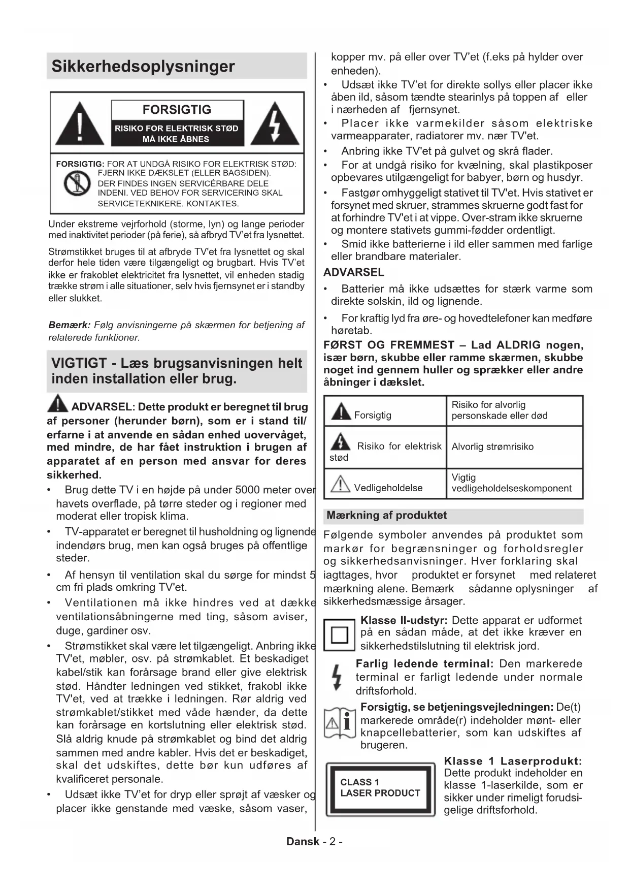 For at undgå risiko for kvælning, skal plastikposer opbevares utilgængeligt for babyer, børn og husdyr. Fastgør omhyggeligt stativet til TV'et. Hvis stativet er forsynet med skruer, strammes skruerne godt fast for at forhindre TV'et i at vippe. Over-stram ikke skruerne og montere stativets gummi-fødder ordentligt. Smid ikke batterierne i ild eller sammen med farlige eller brandbare materialer. ADVARSEL Batterier må ikke udsættes for stærk varme som direkte solskin, ild og lignende. For kraftig lyd fra øre- og hovedtelefoner kan medføre høretab. FØRST OG FREMMEST – Lad ALDRIG nogen, især børn, skubbe eller ramme skærmen, skubbe noget ind gennem huller og sprækker eller andre åbninger i dækslet. ForsigtigRisiko for alvorlig personskade eller død Risiko for elektrisk stød Alvorlig strømrisiko VedligeholdelseVigtig vedligeholdelseskomponent Mærkning af produktet Følgende symboler anvendes på produktet som markør for begrænsninger og forholdsregler