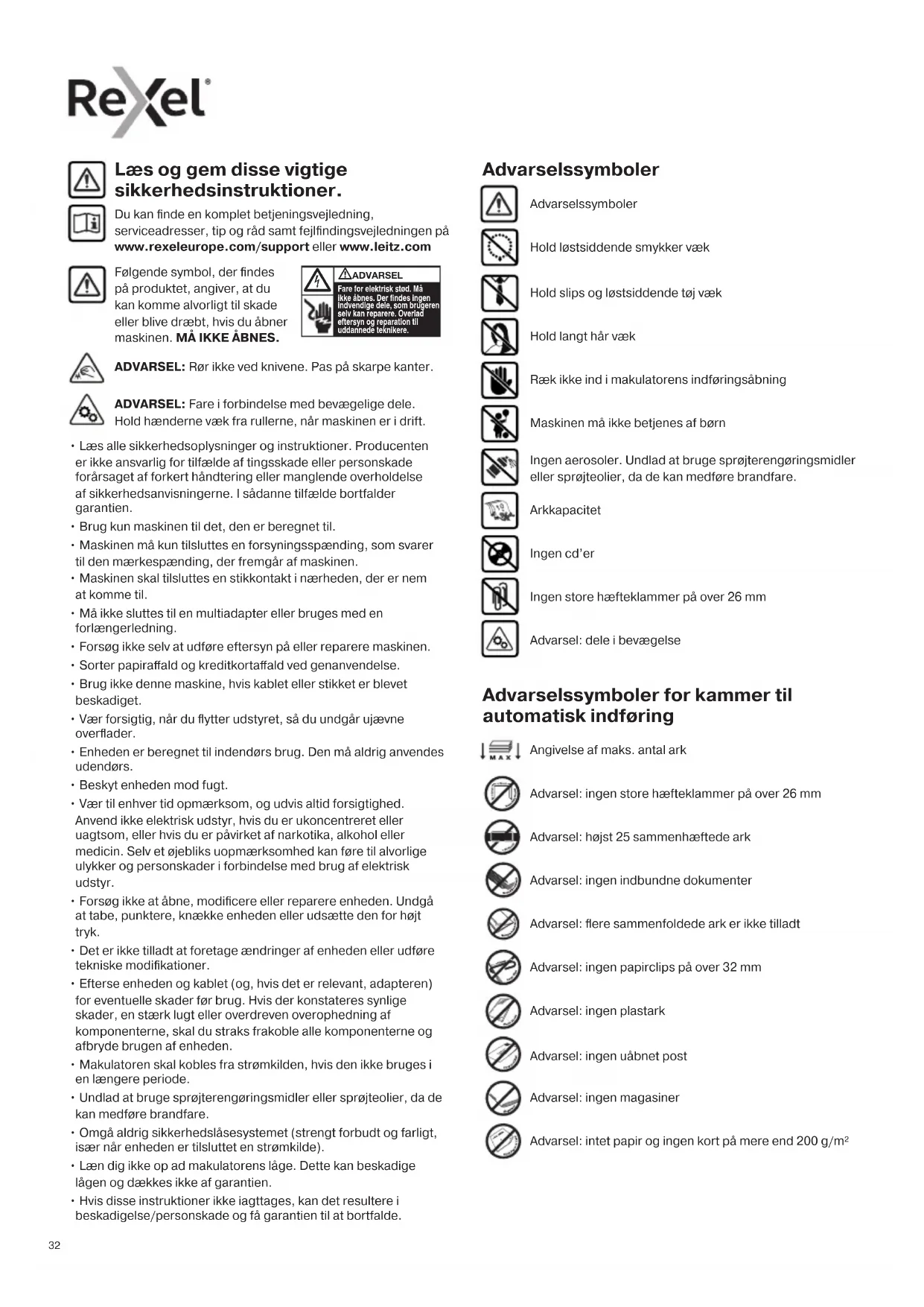 - Hvis disse instruktioner ikke iagttages, kan det resultere i beskadigelse/personskade og få garantien til at bortfalde. Læs og gem disse vigtige sikkerhedsinstruktioner. Du kan finde en komplet betjeningsvejledning, serviceadresser, tip og råd samt fejlfindingsvejledningen på www.rexeleurope.com/support eller www.leitz.com Hold løstsiddende smykker væk Hold slips og løstsiddende tøj væk Advarselssymboler Hold langt hår væk Ræk ikke ind i makulatorens indføringsåbning Advarselssymboler Arkkapacitet Ingen cd’er Ingen store hæfteklammer på over 26 mm Advarsel: dele i bevægelse ADVARSEL: Rør ikke ved knivene. Pas på skarpe kanter. ADVARSEL: Fare i forbindelse med bevægelige dele. Hold hænderne væk fra rullerne, når maskinen er i drift. Maskinen må ikke betjenes af børn Ingen aerosoler. Undlad at bruge sprøjterengøringsmidler eller sprøjteolier, da de kan medføre brandfare. Advarsel: ingen store hæfteklammer på over 26 mm Advarsel: ingen indbundne dokumenter Advarsel: højst 25 sammenhæftede ark Advarselssymboler for kammer til automatisk indføring Advarsel: flere sammenfoldede ark er ikke tilladt Advarsel: ingen papirclips på over 32 mm Angivelse af maks. antal ark Advarsel: ingen magasiner Advarsel: intet papir og ingen kort på mere end 200 g/m² Advarsel: ingen plastark Advarsel: ingen uåbnet post333333 Ikon Type Modeller Knap/indikator og handling Knappen Auto-start og standby (tryk én gang) Knap til manuel baglæns rotation (holdes nede) Knap til manuel fremadkørsel (holdes nede) Indikator for driftsklar tilstand Indikator for overophedning (lad makulatoren køle af) Indikator for overbelastning/ indikator for papirstop (reducer ark/fjern papirstop) Indikator for fuld kurv (åbn lågen, og tøm kurven. 45X – løft makulatorhovedet af, og tøm kurven) Indikator for åben låge eller manglende makulatorhoved (luk lågen med et fast tryk, eller monter makulatorhovedet på kurven igen) Indikator for låst indføringslåg (låses op ved at indtaste 4-cifret kombination) Indføringslåg låses – sikkerhedskombinationsknap 1 Indføringslåg låses – sikkerhedskombinationsknap 2 Indføringslåg låses – sikkerhedskombinationsknap 3 Indføringslåg låses – sikkerhedskombinationsknap 4 Betjening