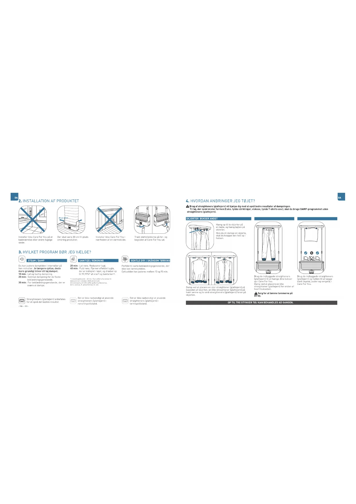 STEAM / DAMP Du kan justere damptiden i intervaller på fem minutter. Jo længere cyklus, desto mere grundigt bliver dit tøj dampet. 10 min: Let og hurtig dampning. 20 min: Optimal dampning for de fleste beklædningsgenstande. 30 min: For beklædningsgenstande, der er svære at dampe. SANITIZE / RENSNING 20 min: Let rens. Reducerer lugt. 40 min: Fuld rens. Fjerner effektivt lugte, der er indlejret i tøjet, og dræber op til 99,99%* af vira (1) og bakterier (2)