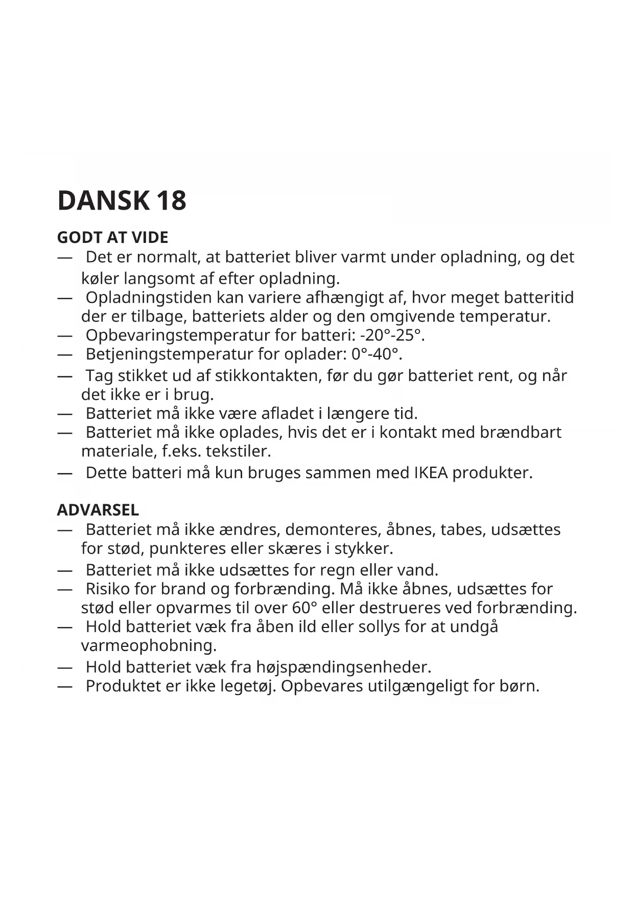 — Det er normalt, at batteriet bliver varmt under opladning, og det køler langsomt af efter opladning. — Opladningstiden kan variere afhængigt af, hvor meget batteritid der er tilbage, batteriets alder og den omgivende temperatur. — Opbevaringstemperatur for batteri: -20°-25°. — Betjeningstemperatur for oplader: 0°-40°. — Tag stikket ud af stikkontakten, før du gør batteriet rent, og når det ikke er i brug. — Batteriet må ikke være aadet i længere tid. — Batteriet må ikke oplades, hvis det er i kontakt med brændbart materiale, f.eks. tekstiler. — Dette batteri må kun bruges sammen med IKEA produkter. ADVARSEL — Batteriet må ikke ændres, demonteres, åbnes, tabes, udsættes for stød, punkteres eller skæres i stykker. — Batteriet må ikke udsættes for regn eller vand. — Risiko for brand og forbrænding. Må ikke åbnes, udsættes for stød eller opvarmes til over 60° eller destrueres ved forbrænding. — Hold batteriet væk fra åben ild eller sollys for at undgå varmeophobning. — Hold batteriet væk fra højspændingsenheder. — Produktet er ikke legetøj. Opbevares utilgængeligt for børn.19 Sørg for, at alle, der bruger dette produkt, læser og følger disse advarsler og anvisninger. — Batteriet eller dets celler må ikke kortsluttes. — Hvis en celle lækker, må væsken ikke komme i kontakt med hud eller øjne. VEDLIGEHOLDELSE Rengør enheden med en fugtig, blød klud og lidt mildt rengøringsmiddel. Tør efter med en tør, blød klud. BEMÆRK! Brug aldrig slibende rengøringsmidler eller kemiske opløsningsmidler, da det kan beskadige produktet. Servicering af produktet Forsøg ikke at reparere dette produkt selv, fordi du kan blive udsat for farlig spænding eller andre risici, hvis du åbner eller fjerner dækslerne.20 TEKNISKE DATA Type: ICBL7.2-18-USB-A1 Kapacitet: 2600mAh/18,72Wh Indgangseekt: DC 5V, 1.0A (mikro-USB) DC 8.4V, 2.0A (stik med 4 ben) Udgangseekt: DC 7.2V, 2.0A Kun til indendørs brug Genopladeligt Li-polymer-batteri indvendigt. Denne enhed overholder UL STD: 2054 Producent: IKEA of Sweden AB Adresse: Box 702, SE-343 81 Älmhult, SVERIGE Symbolet med den overkrydsede aaldsspand på hjul angiver, at produktet skal bortskaes adskilt fra husholdningsaald. Produktet skal indleveres til genbrug i henhold til den lokale miljølovgivning for bortskaelse af aald. Ved at adskille produktet fra husholdningsaald hjælper du med at reducere den mængde aald, der sendes til forbrænding eller på lossepladsen, og minimerer eventuelle negative indvirkninger på menneskers sundhed og miljøet. Kontakt det nærmeste IKEA varehus for at få ere oplysninger.ÍSLENSKA 21