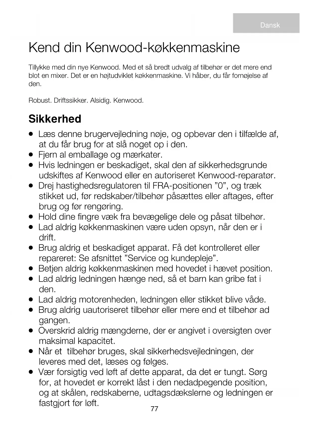 UDSTYR (WEEE) Ved afslutningen af dets produktive liv må produktet ikke bortskaffes som almindeligt affald. Det bør afleveres på et specialiseret lokalt genbrugscenter eller til en forhandler, der yder denne service. At bortskaffe et elektrisk husholdningsapparat separat gør det muligt at undgå eventuelle negative konsekvenser for miljø og helbred på grund af uhensigtsmæssig bortskaffelse, og det giver mulighed for at genbruge de materialer det består af, og dermed opnå en betydelig energi- og ressourcebesparelse. Som en påmindelse om nødvendigheden af at bortskaffe elektriske husholdningsapparater separat, er produktet mærket med en mobil affaldsbeholder med et kryds.86 Problem Årsag Løsning Piskeriset eller Redskab i forkert højde, Juster højden ved hjælp af en K-spaden slår mod justering nødvendig. egnet skruenøgle – se afsnittet bunden af skålen eller ”Redskabsjustering”. når ikke ingredienserne i bunden af skålen. Lavhastighedstilbehør Kontroller, at dit tilbehør er Tilbehør skal have KAX- kan ikke fastgøres. kompatibelt til brug med vridetilslutningssystem for din model. at passe til udtaget. Vridetilslutningssystem Hvis dit eget tilbehør har påkrævet (Model KAX) stangtilslutningssystem , skal du bruge KAT002ME- mellemstykket til at tilslutte disse til vridetilslutningssystemet på din køkkenmaskine. For at få flere oplysninger kan du besøge www.kenwoodworld.com/twist “Indikatorlampen for Hastighedsregulator ikke i Kontroller og drej røremaskine klar” ”O”-positionen. hastighedsregulatoren til ”O”- blinker, første gang positionen. køkkenmaskinens stik Mixerhoved i hævet Kontroller, at køkkenmaskinens sættes i. position eller ikke låst hoved er korrekt låst nede. nede korrekt. Køkkenmaskinen stopper Overbelastningsbeskyttelse Træk stikket ud, og kontroller for under betjening. eller overophedningssystem forhindring eller overbelastning. “Indikatorlampen for aktiveret. Drej hastighedsregulatoren til ”O”, røremaskine klar” blinker Maksimal kapacitet og start igen. hurtigt. overskredet. Hvis maskinen ikke fungerer, skal nogle af ingredienserne fjernes for at reducere belastningen og derefter startes igen. Hvis dette stadig ikke løser problemet, skal stikket trækkes ud, og maskinen skal stå i 15 minutter. Sæt stikket i, og vælg hastighed igen. Hvis maskinen ikke starter igen efter ovenstående procedure, skal du kontakte ”kundeservice” at få yderligere råd. “Indikatorlampen for Køkkenmaskinen har stået Drej hastighedskontrollen til røremaskine klar” er slået med stikket sat i i mere “min”, og sæt den tilbage på “O” fra, mens maskinens stik er end 30 minutter uden at for at nulstille maskinen. sat i. blive betjent og er gået i standby-tilstand. Fejlfindingsguide87 Lär känna din köksmaskin från Kenwood Grattis till ditt köp av en Kenwood. Med ett stort sortiment av tillbehör är det mer än en vanlig matberedare. Det är en toppmodern köksmaskin. Vi hoppas att du får glädje av den. Robust. Pålitlig. Mångsidig. Kenwood. Säkerhet