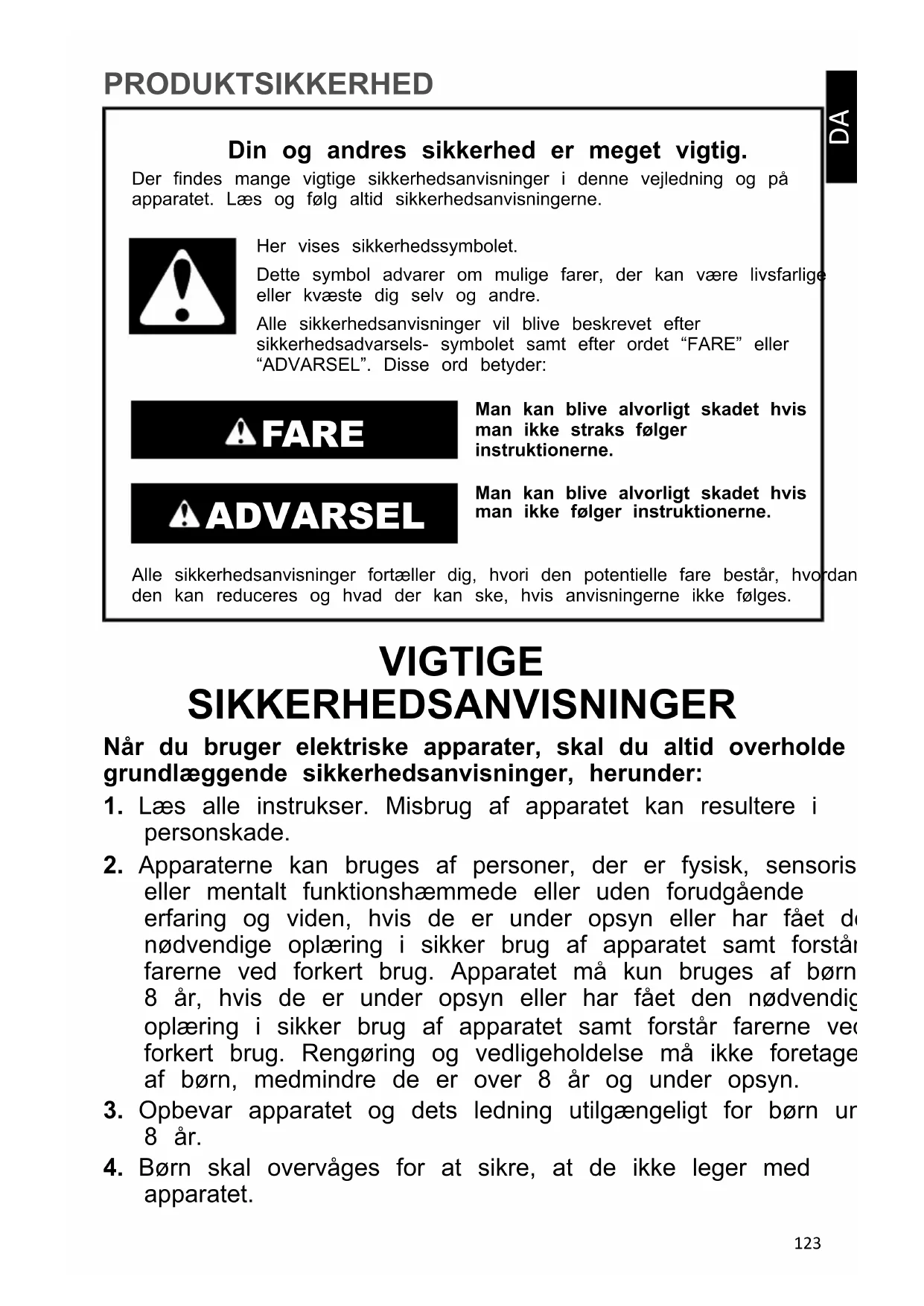 PRODUKTSIKKERHED Din og andres sikkerhed er meget vigtig. Der findes mange vigtige sikkerhedsanvisninger i denne vejledning og på apparatet. Læs og følg altid sikkerhedsanvisningerne. Her vises sikkerhedssymbolet. Dette symbol advarer om mulige farer, der kan være livsfarlige eller kvæste dig selv og andre. Alle sikkerhedsanvisninger vil blive beskrevet efter sikkerhedsadvarsels- symbolet samt efter ordet “FARE” eller “ADVARSEL”. Disse ord betyder: FARE Man kan blive alvorligt skadet hvis man ikke straks følger instruktionerne. ADVARSEL Man kan blive alvorligt skadet hvis man ikke følger instruktionerne. Alle sikkerhedsanvisninger fortæller dig, hvori den potentielle fare består, hvordan den kan reduceres og hvad der kan ske, hvis anvisningerne ikke følges. VIGTIGE SIKKERHEDSANVISNINGER Når du bruger elektriske apparater, skal du altid overholde de grundlæggende sikkerhedsanvisninger, herunder: