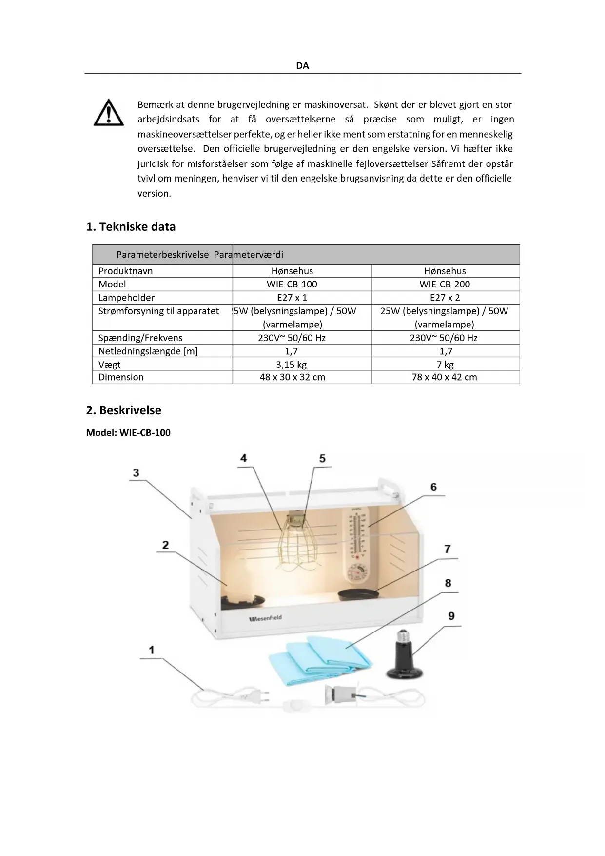 Parameterbeskrivelse Parameterværdi Produktnavn Hønsehus Hønsehus Model WIE-CB-100 WIE-CB-200 Lampeholder E27 x 1 E27 x 2 Strømforsyning til apparatet 25W (belysningslampe) / 50W (varmelampe) 25W (belysningslampe) / 50W (varmelampe) Spænding/Frekvens 230V~ 50/60 Hz 230V~ 50/60 Hz Netledningslængde [m] 1,7 1,7 Vægt 3,15 kg 7 kg Dimension 48 x 30 x 32 cm 78 x 40 x 42 cm