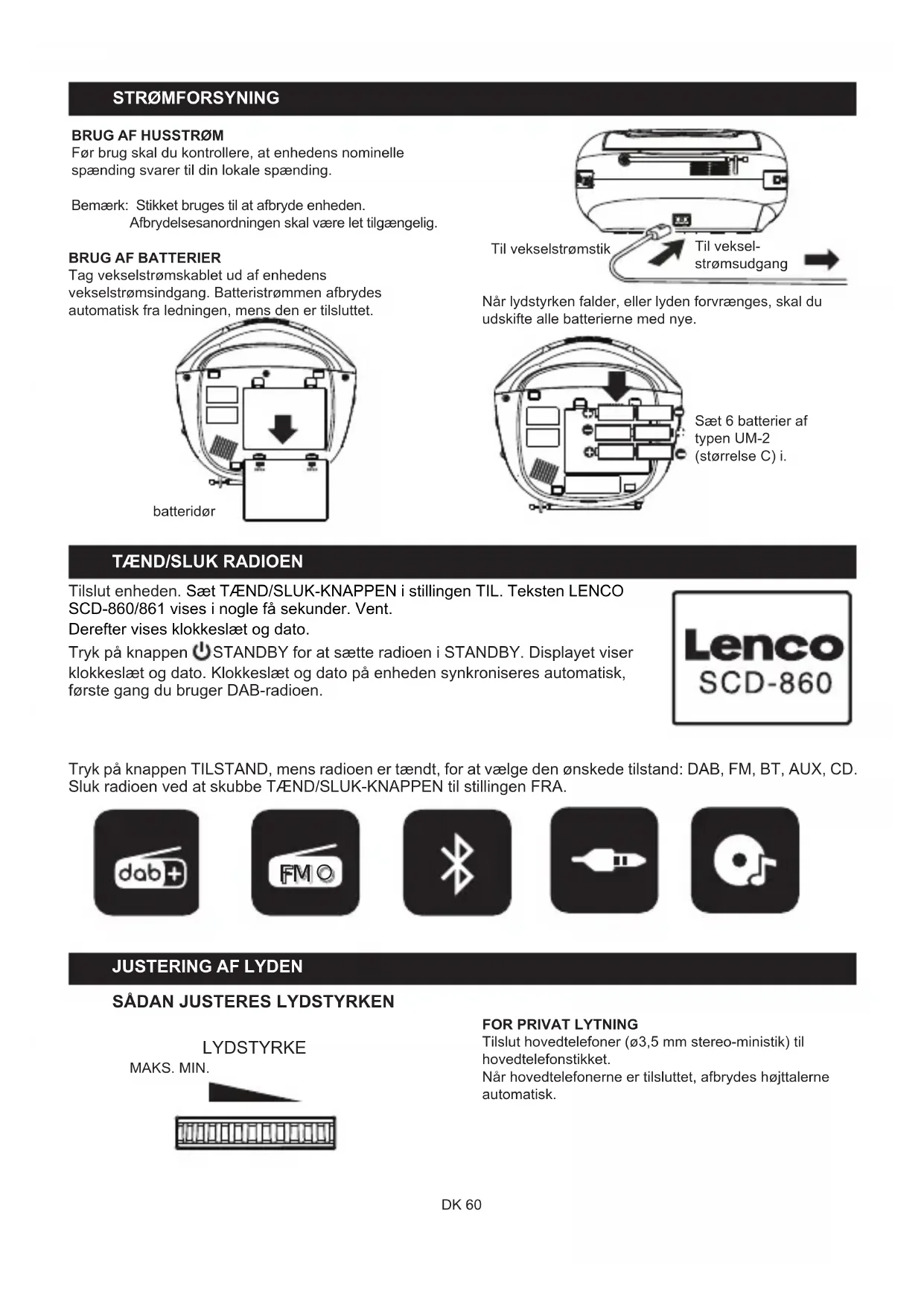 Tilslut enheden. Sæt TÆND/SLUK-KNAPPEN i stillingen TIL. Teksten LENCO SCD-860/861 vises i nogle få sekunder. Vent. Derefter vises klokkeslæt og dato. Tryk på knappen STANDBY for at sætte radioen i STANDBY. Displayet viser klokkeslæt og dato. Klokkeslæt og dato på enheden synkroniseres automatisk, første gang du bruger DAB-radioen. Tryk på knappen TILSTAND, mens radioen er tændt, for at vælge den ønskede tilstand: DAB, FM, BT, AUX, CD. Sluk radioen ved at skubbe TÆND/SLUK-KNAPPEN til stillingen FRA.