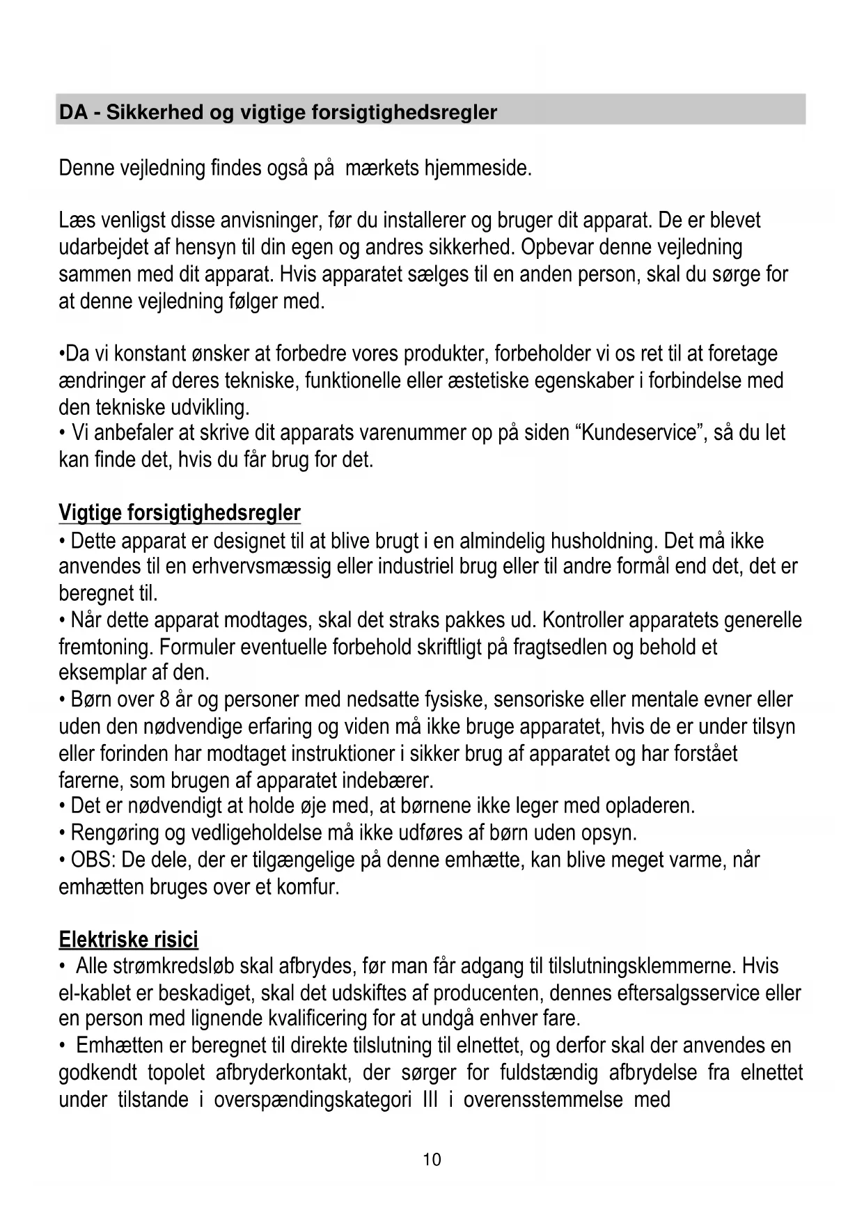 - Vi anbefaler at skrive dit apparats varenummer op på siden “Kundeservice”, så du let kan finde det, hvis du får brug for det. Vigtige forsigtighedsregler