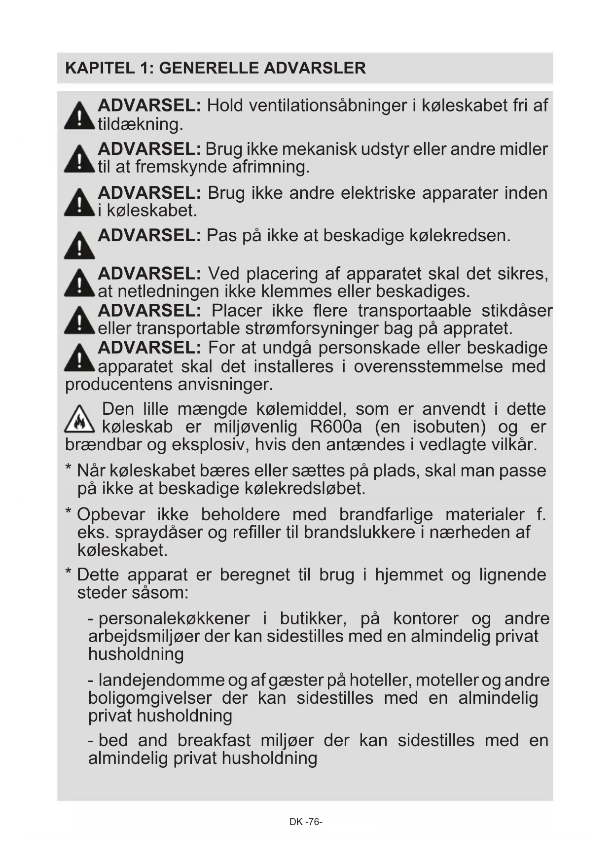 ADVARSEL: Hold ventilationsåbninger i køleskabet fri af tildækning. ADVARSEL: Brug ikke mekanisk udstyr eller andre midler til at fremskynde afrimning. ADVARSEL: Brug ikke andre elektriske apparater inden i køleskabet. ADVARSEL: Pas på ikke at beskadige kølekredsen. ADVARSEL: Ved placering af apparatet skal det sikres, at netledningen ikke klemmes eller beskadiges. ADVARSEL: Placer ikke ere transportaable stikdåser eller transportable strømforsyninger bag på appratet. ADVARSEL: For at undgå personskade eller beskadige apparatet skal det installeres i overensstemmelse med producentens anvisninger. Den lille mængde kølemiddel, som er anvendt i dette køleskab er miljøvenlig R600a (en isobuten) og er brændbar og eksplosiv, hvis den antændes i vedlagte vilkår.
