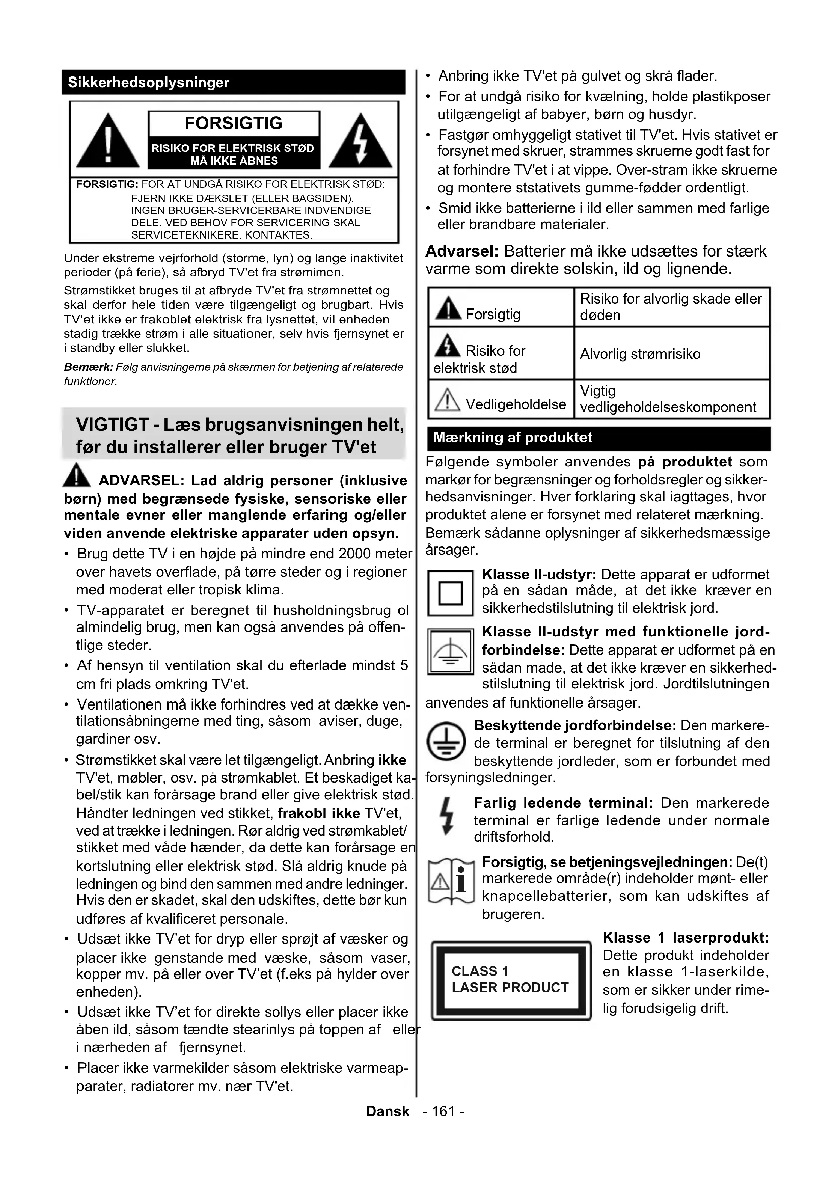 Smart Center ....................................................... 188Dansk - 161 - Sikkerhedsoplysninger FORSIGTIG RISIKO FOR ELEKTRISK STØDMÅ IKKE ÅBNESFORSIGTIG: FOR AT UNDGÅ RISIKO FOR ELEKTRISK STØD: FJERN IKKE DÆKSLET (ELLER BAGSIDEN). INGEN BRUGER-SERVICERBARE INDVENDIGE DELE. VED BEHOV FOR SERVICERING SKAL SERVICETEKNIKERE. KONTAKTES.Bemærk: Følg anvisningerne på skærmen for betjening af relaterede funktioner.Under ekstreme vejrforhold (storme, lyn) og lange inaktivitet men.Strømskal derfor hele tiden være tilgængeligt og brugbart. Hvis stadig trække strøm i alle situationer, selv hvis fjernsynet er i standby eller slukket. VIGTIGT - Læs brugsanvisningen helt, før du installerer eller bruger TV'et ADVARSEL: Lad aldrig personer (inklusive børn) med begrænsede fysiske, sensoriske eller mentale evner eller manglende erfaring og/eller viden anvende elektriske apparater uden opsyn.