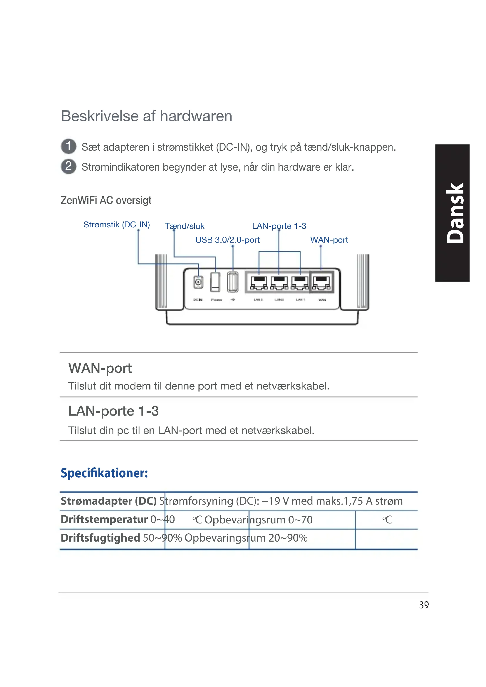 Driftsfugtighed 50~90% Opbevaringsrum 20~90% Specikationer:40 Dansk Forberedelse til opsætning af en enkeltstående router