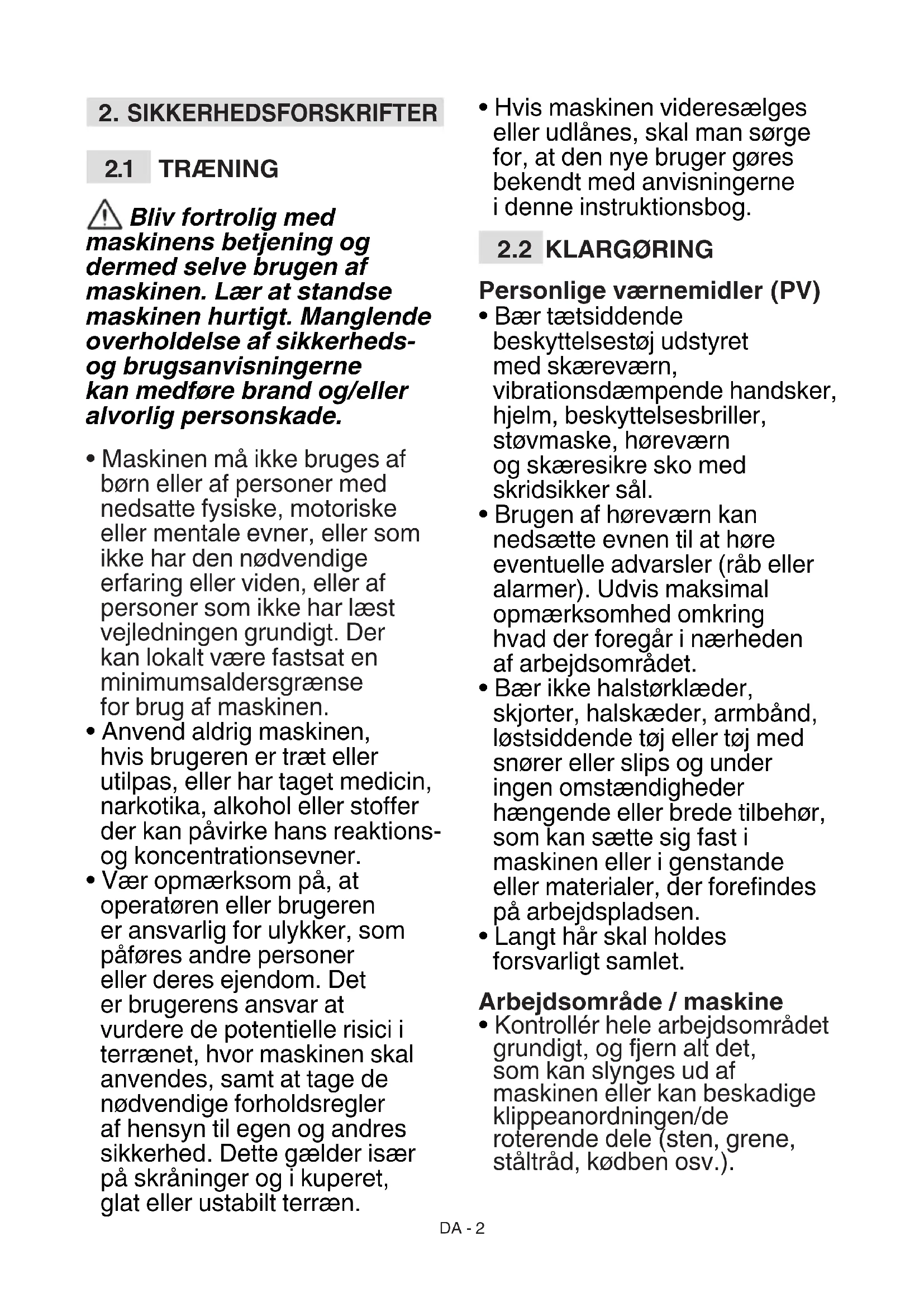 - Vær opmærksom på, at operatøren eller brugeren er ansvarlig for ulykker, som påføres andre personer eller deres ejendom. Det er brugerens ansvar at vurdere de potentielle risici i terrænet, hvor maskinen skal anvendes, samt at tage de nødvendige forholdsregler af hensyn til egen og andres sikkerhed. Dette gælder især på skråninger og i kuperet, glat eller ustabilt terræn.