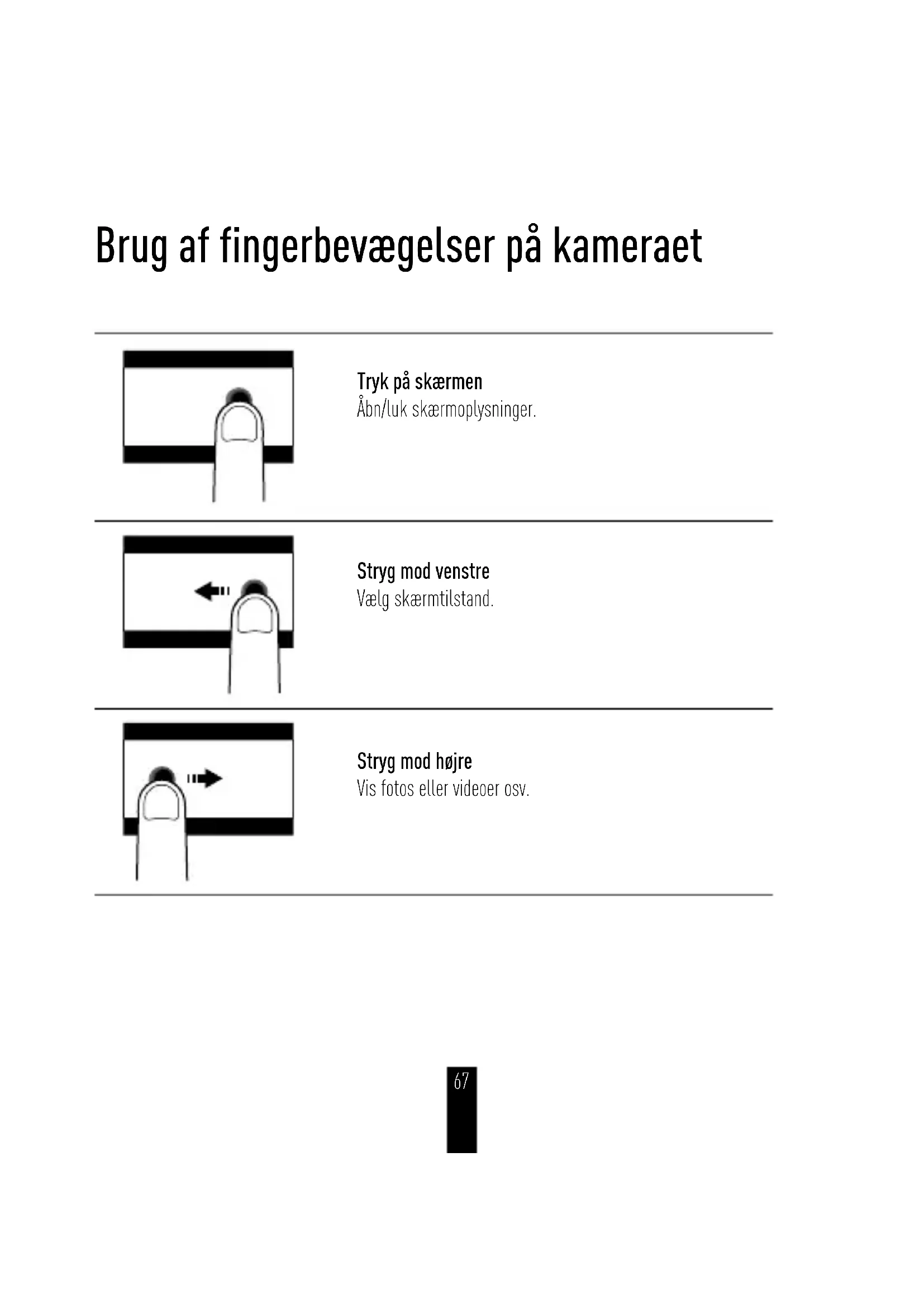 66Tryk på skærmen Åbn/luk skærmoplysninger. Stryg mod venstre Vælg skærmtilstand. Stryg mod højre Vis fotos eller videoer osv. Brug af fingerbevægelser på kameraet 67DK Stryg nedad Aktivér låseskærm eller andre indstillinger. Stryg nedad på siden Indstilling Vend tilbage til livevisning. 68Trin 1 Betjening Indsæt microSD-kortet. Kameraet understøtter lagring af video og billede på det lokale hukommelseskort. Kapacitet af microSD-kort: > 4 GB Niveaukrav for microSD-kort: Klasse 10 eller højere. Anbefaling af microSD-kort: SANDISK EXTREME