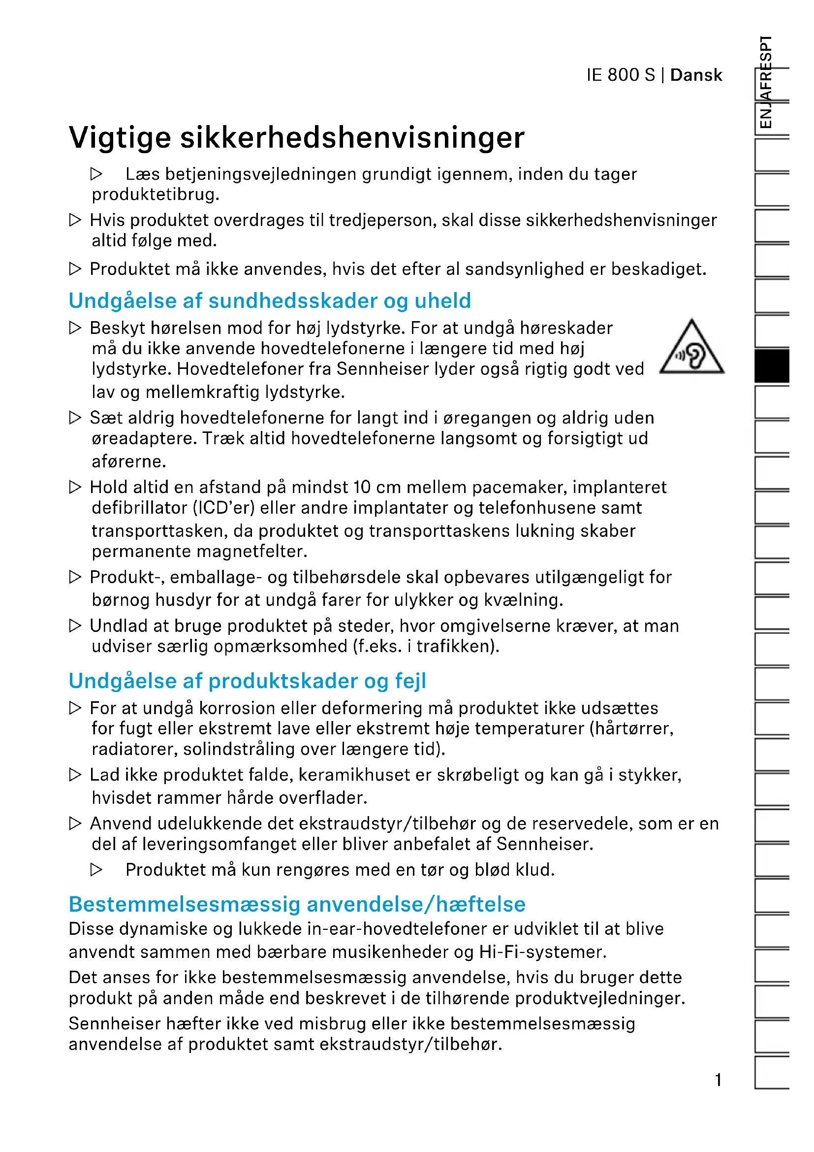 - Direttiva RAEE (2012/19/UE) Il simbolo barrato del bidone dei rifiuti su ruote, presente sul prodotto o sulle relative pile/batterie (ove applicabile) e/o con- fezione, indica che, a utilizzo terminato, i prodotti non possono essere smaltiti con i rifiuti domestici, ma devono essere conferiti in impianti di smaltimento separati. Per quanto riguarda le confezioni, osservare le disposi- zioni di legge in materia di raccolta differenziata vigenti nel proprio Paese. Ulteriori informazioni sul riciclo dei presenti prodotti sono disponibili presso la propria amministrazione comunale, nei punti di raccolta o ritiro o presso il centro servizi Sennheiser di fiducia. La raccolta differenziata di apparecchi elettrici ed elettronici vecchi, di pile/ batterie (ove applicabile) e confezioni serve a incentivare il riutilizzo e/o la va- lorizzazione dei materiali e a evitare effetti negativi causati, ad es., da sostanze potenzialmente dannose contenute in essi. In tal modo si dà un importante contributo alla tutela dell’ambiente e della salute.1 IE 800 S | Dansk ENJAFRESPTNLITDASVFIELPLTRRUZHTWKOIDEELVLTCSSKHUROBGSLHR DE Vigtige sikkerhedshenvisninger ▷ Læs betjeningsvejledningen grundigt igennem, inden du tager produktetibrug. ▷ Hvis produktet overdrages til tredjeperson, skal disse sikkerhedshenvisninger altid følge med. ▷ Produktet må ikke anvendes, hvis det efter al sandsynlighed er beskadiget. Undgåelse af sundhedsskader og uheld ▷ Beskyt hørelsen mod for høj lydstyrke. For at undgå høreskader må du ikke anvende hovedtelefonerne i længere tid med høj lydstyrke. Hovedtelefoner fra Sennheiser lyder også rigtig godt ved lav og mellemkraftig lydstyrke. ▷ Sæt aldrig hovedtelefonerne for langt ind i øregangen og aldrig uden øreadaptere. Træk altid hovedtelefonerne langsomt og forsigtigt ud aførerne. ▷ Hold altid en afstand på mindst 10 cm mellem pacemaker, implanteret defibrillator (ICD’er) eller andre implantater og telefonhusene samt transporttasken, da produktet og transporttaskens lukning skaber permanente magnetfelter. ▷ Produkt-, emballage- og tilbehørsdele skal opbevares utilgængeligt for børnog husdyr for at undgå farer for ulykker og kvælning. ▷ Undlad at bruge produktet på steder, hvor omgivelserne kræver, at man udviser særlig opmærksomhed (f.eks. i trafikken). Undgåelse af produktskader og fejl ▷ For at undgå korrosion eller deformering må produktet ikke udsættes for fugt eller ekstremt lave eller ekstremt høje temperaturer (hårtørrer, radiatorer, solindstråling over længere tid). ▷ Lad ikke produktet falde, keramikhuset er skrøbeligt og kan gå i stykker, hvisdet rammer hårde overflader. ▷ Anvend udelukkende det ekstraudstyr/tilbehør og de reservedele, som er en del af leveringsomfanget eller bliver anbefalet af Sennheiser. ▷ Produktet må kun rengøres med en tør og blød klud. Bestemmelsesmæssig anvendelse/hæftelse Disse dynamiske og lukkede in-ear-hovedtelefoner er udviklet til at blive anvendt sammen med bærbare musikenheder og Hi-Fi-systemer. Det anses for ikke bestemmelsesmæssig anvendelse, hvis du bruger dette produkt på anden måde end beskrevet i de tilhørende produktvejledninger. Sennheiser hæfter ikke ved misbrug eller ikke bestemmelsesmæssig anvendelse af produktet samt ekstraudstyr/tilbehør. DA Betjeningsvejledning2 Dansk | IE 800 S Leveringsomfang 1 Øregangshovedtelefon IE 800 S, kabellængde ca. 0,25 m Tilslutningskabel 1 2,5 mm stereo-jackstik, symmetrisk, længde ca. 1 m 1 3,5 mm stereo-jackstik, længde ca. 1 m 1 4,4 mm Pentaconn-stereo-jackstik, symmetrisk, længde ca. 1,1 m Øreadaptere (som par): 3 silikone, størrelse S, M (sat på hovedtelefonerne ved levering) og L 3 Comply™, størrelse S, M og L 1 betjeningsvejledning 1 transporttaske 1 mikrofiberklud IE 800 S