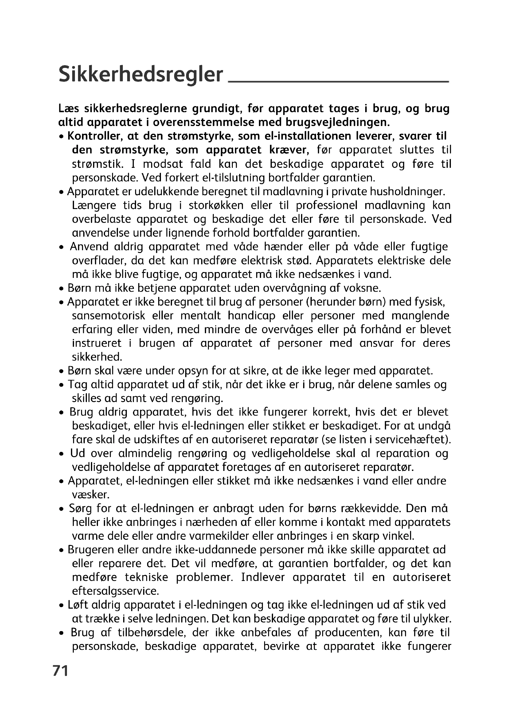 Viktig: Blanderen er utstyrt med et meget skarpt knivblad. Vær derfor forsiktig ved rengjøring. SM_MIXER_PREPLINE_EO_2550865-02_2550865-02 09/12/10 16:22 Page70Sikkerhedsregler Læs sikkerhedsreglerne grundigt, før apparatet tages i brug, og brug altid apparatet i overensstemmelse med brugsvejledningen.