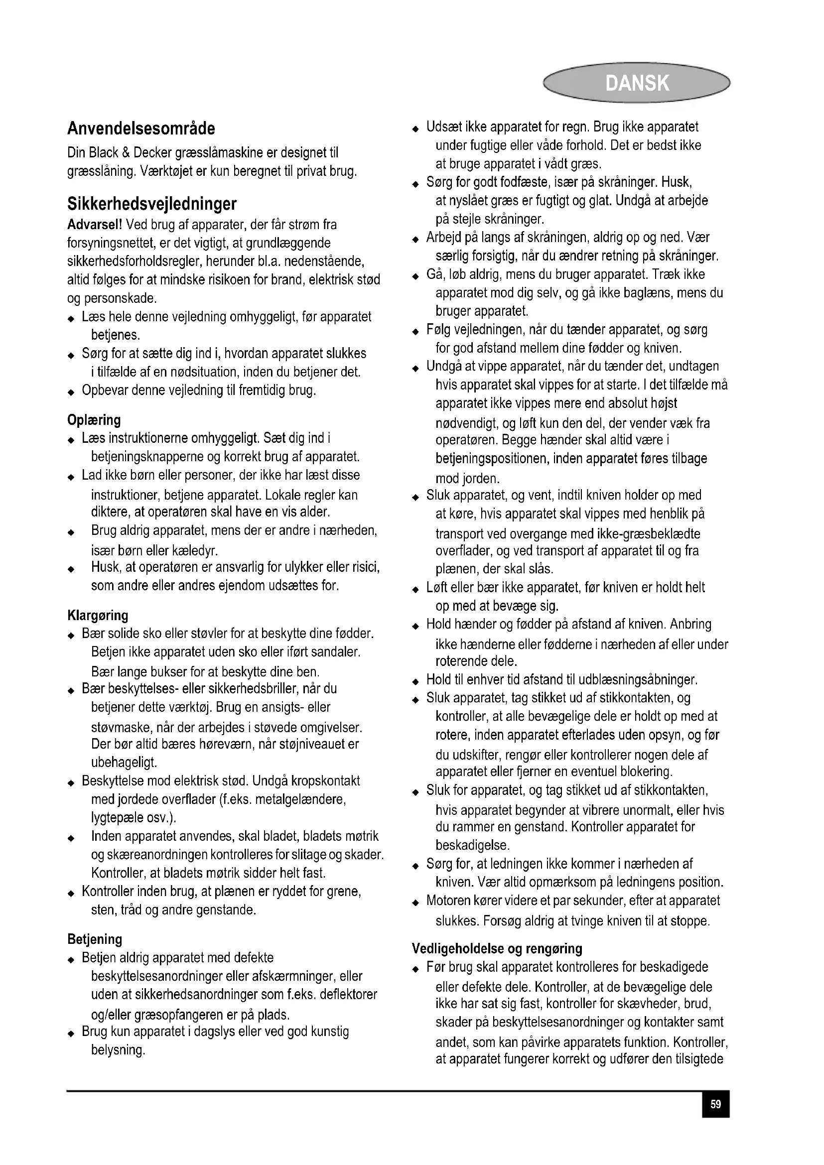 reparasjoner er forsøkt utført av andre enn autoriserte serviceverksteder eller Black & Deckers serviceteknikere. For å ta garantien i bruk skal produktet og kjøpekvittering leveres til forhandleren eller til et autorisert serviceverksted. For informasjon om nærmeste autoriserte serviceverksted, kontakt ditt lokale Black & Decker-kontor på den adressen som er angitt i bruksanvisningen. En oversikt over autoriserte serviceverksteder og opplysninger om ettersalgsservice og kontakter er også tilgjengelig på Internett: www.2helpU.com Besøk vårt webområde www.blackanddecker.no for å registrere ditt nye Black & Decker-produkt og for å holde deg oppdatert om nye produkter og spesialtilbud. Du finner mer informasjon om Black & Decker og produktutvalget vårt på www.blackanddecker.no.59 DANSK Dansk Anvendelsesområde Din Black & Decker græsslåmaskine er designet til græsslåning. Værktøjet er kun beregnet til privat brug. Sikkerhedsvejledninger Advarsel! Ved brug af apparater, der får strøm fra forsyningsnettet, er det vigtigt, at grundlæggende sikkerhedsforholdsregler, herunder bl.a. nedenstående, altid følges for at mindske risikoen for brand, elektrisk stød og personskade. Læs hele denne vejledning omhyggeligt, før apparatet betjenes. Sørg for at sætte dig ind i, hvordan apparatet slukkes i tilfælde af en nødsituation, inden du betjener det. Opbevar denne vejledning til fremtidig brug. Oplæring Læs instruktionerne omhyggeligt. Sæt dig ind i betjeningsknapperne og korrekt brug af apparatet. Lad ikke børn eller personer, der ikke har læst disse instruktioner, betjene apparatet. Lokale regler kan diktere, at operatøren skal have en vis alder. Brug aldrig apparatet, mens der er andre i nærheden, især børn eller kæledyr. Husk, at operatøren er ansvarlig for ulykker eller risici, som andre eller andres ejendom udsættes for. Klargøring Bær solide sko eller støvler for at beskytte dine fødder. Betjen ikke apparatet uden sko eller iført sandaler. Bær lange bukser for at beskytte dine ben. Bær beskyttelses- eller sikkerhedsbriller, når du betjener dette værktøj. Brug en ansigts- eller støvmaske, når der arbejdes i støvede omgivelser. Der bør altid bæres høreværn, når støjniveauet er ubehageligt. Beskyttelse mod elektrisk stød. Undgå kropskontakt med jordede overflader (f.eks. metalgelændere, lygtepæle osv.). Inden apparatet anvendes, skal bladet, bladets møtrik og skæreanordningen kontrolleres for slitage og skader. Kontroller, at bladets møtrik sidder helt fast. Kontroller inden brug, at plænen er ryddet for grene, sten, tråd og andre genstande. Betjening Betjen aldrig apparatet med defekte beskyttelsesanordninger eller afskærmninger, eller uden at sikkerhedsanordninger som f.eks. deflektorer og/eller græsopfangeren er på plads. Brug kun apparatet i dagslys eller ved god kunstig belysning. Udsæt ikke apparatet for regn. Brug ikke apparatet under fugtige eller våde forhold. Det er bedst ikke at bruge apparatet i vådt græs. Sørg for godt fodfæste, især på skråninger. Husk, at nyslået græs er fugtigt og glat. Undgå at arbejde på stejle skråninger. Arbejd på langs af skråningen, aldrig op og ned. Vær særlig forsigtig, når du ændrer retning på skråninger. Gå, løb aldrig, mens du bruger apparatet. Træk ikke apparatet mod dig selv, og gå ikke baglæns, mens du bruger apparatet. Følg vejledningen, når du tænder apparatet, og sørg for god afstand mellem dine fødder og kniven. Undgå at vippe apparatet, når du tænder det, undtagen hvis apparatet skal vippes for at starte. I det tilfælde må apparatet ikke vippes mere end absolut højst nødvendigt, og løft kun den del, der vender væk fra operatøren. Begge hænder skal altid være i betjeningspositionen, inden apparatet føres tilbage mod jorden. Sluk apparatet, og vent, indtil kniven holder op med at køre, hvis apparatet skal vippes med henblik på transport ved overgange med ikke-græsbeklædte overflader, og ved transport af apparatet til og fra plænen, der skal slås. Løft eller bær ikke apparatet, før kniven er holdt helt op med at bevæge sig. Hold hænder og fødder på afstand af kniven. Anbring ikke hænderne eller fødderne i nærheden af eller under roterende dele. Hold til enhver tid afstand til udblæsningsåbninger. Sluk apparatet, tag stikket ud af stikkontakten, og kontroller, at alle bevægelige dele er holdt op med at rotere, inden apparatet efterlades uden opsyn, og før du udskifter, rengør eller kontrollerer nogen dele af apparatet eller fjerner en eventuel blokering. Sluk for apparatet, og tag stikket ud af stikkontakten, hvis apparatet begynder at vibrere unormalt, eller hvis du rammer en genstand. Kontroller apparatet for beskadigelse. Sørg for, at ledningen ikke kommer i nærheden af kniven. Vær altid opmærksom på ledningens position. Motoren kører videre et par sekunder, efter at apparatet slukkes. Forsøg aldrig at tvinge kniven til at stoppe. Vedligeholdelse og rengøring Før brug skal apparatet kontrolleres for beskadigede eller defekte dele. Kontroller, at de bevægelige dele ikke har sat sig fast, kontroller for skævheder, brud, skader på beskyttelsesanordninger og kontakter samt andet, som kan påvirke apparatets funktion. Kontroller, at apparatet fungerer korrekt og udfører den tilsigtede60 DANSK funktion. Brug aldrig apparatet, hvis en af beskyttelsesanordningerne eller afskærmningerne er beskadiget eller ikke er på plads. Brug ikke apparatet, hvis nogen del af det er beskadiget eller defekt. Brug ikke apparatet, hvis afbryderen er defekt. Sørg for at få beskadigede eller defekte dele repareret eller udskiftet på et autoriseret værksted. Kontroller ofte netledningen for beskadigelse. Hvis netledningen er beskadiget, skal den udskiftes af et autoriseret reparationsværksted, så farlige situationer undgås. Undersøg forlængerledninger regelmæssigt. Udskrift straks en forlængerledning, hvis den er 