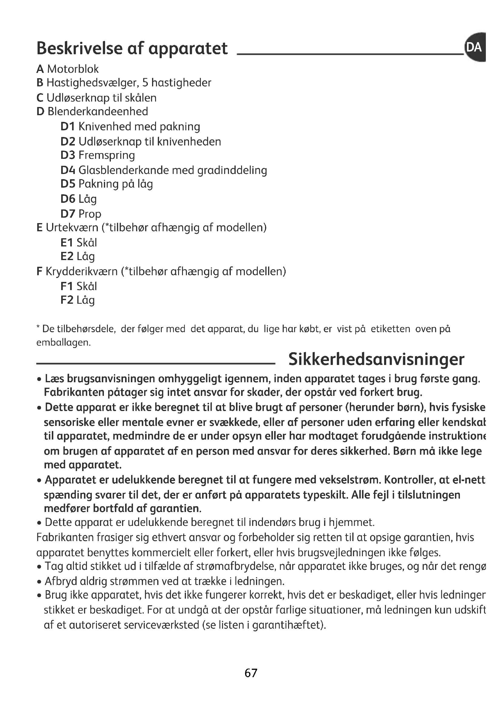 - Vær forsigtig, når du håndterer de slebne knive i knivenheden (D1), urtekværnen (E) og krydderikværnen (F), når du tømmer skålene, eller når du rengør apparatet: De er meget skarpe.